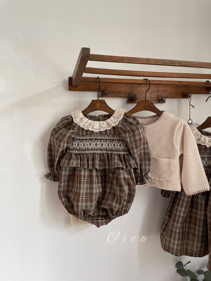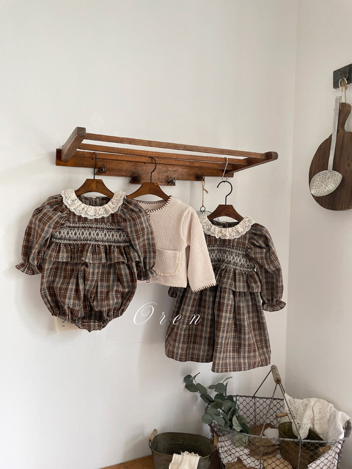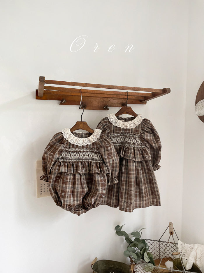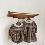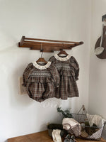 控えめなチェック柄に、スモッキングディテールとラッフル装飾が組み合わさり、