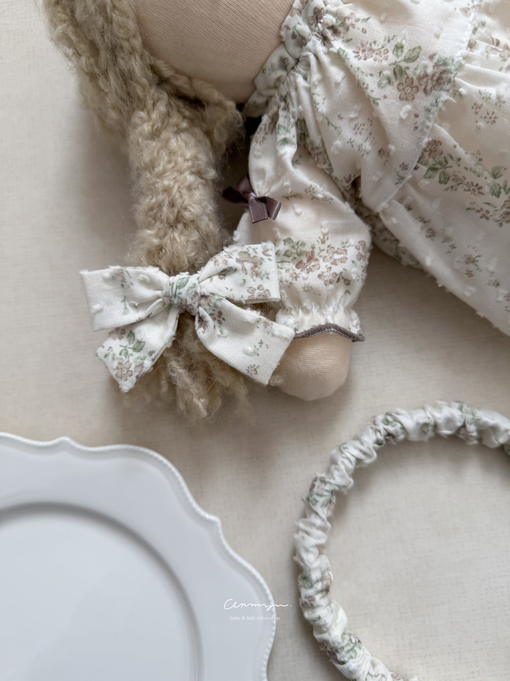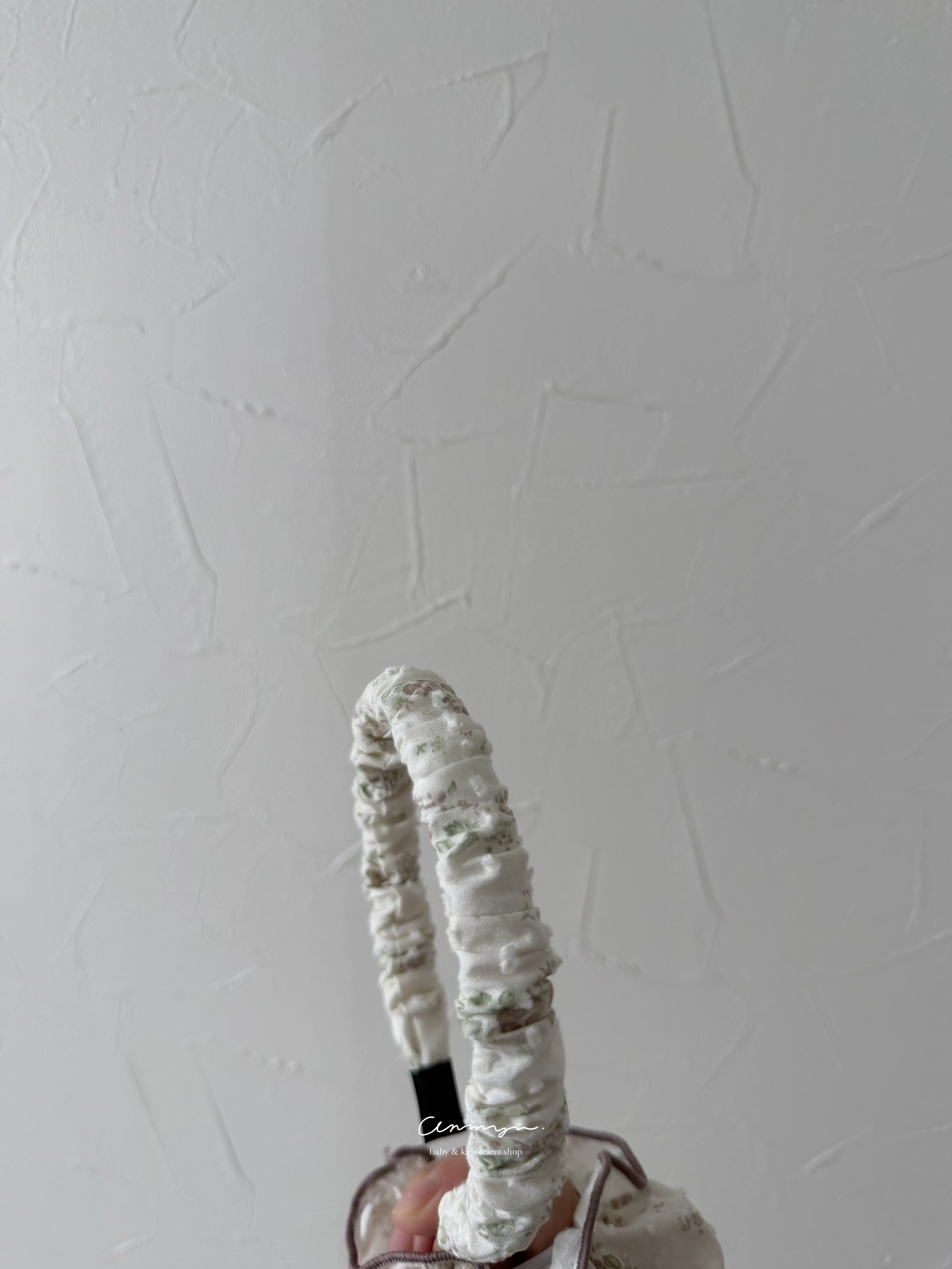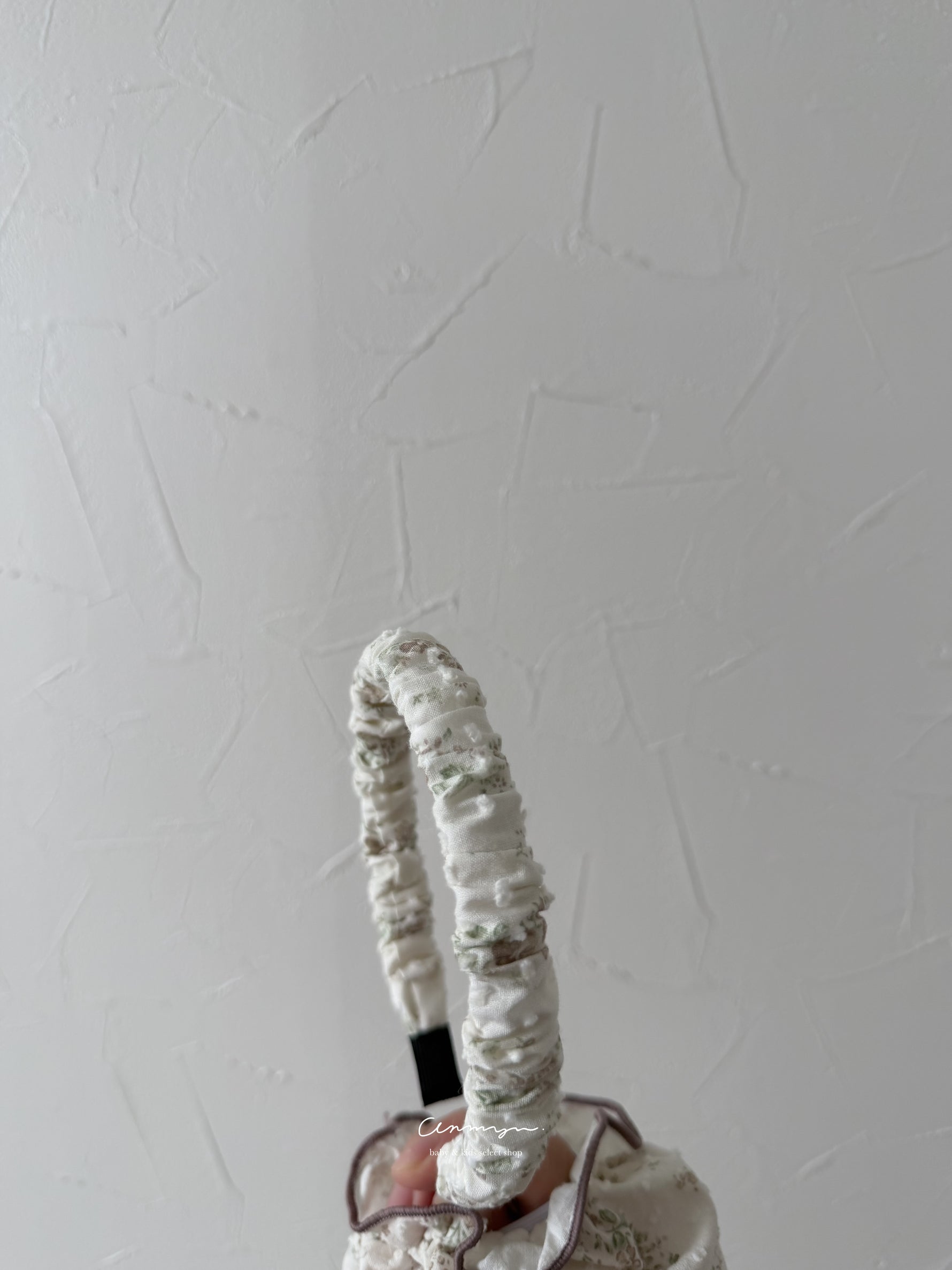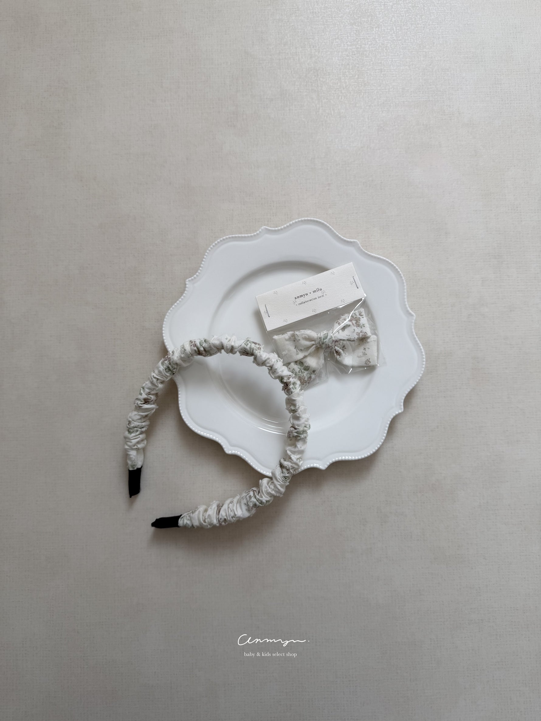 milu × anmyu コラボの「Vello Hairband」は、vello ruffle rompersと同生地で仕立てた特別なヘアアクセ。淡い小花柄がフェミニンに寄り添い、普段使いから撮影コーデまで上品に仕上がります。柔らかい生地で締め付け感が少なく、ベビーにも安心。ロンパースやドール服とのリンクコーデも楽しめる、特別感ある限定ヘアバンドです。