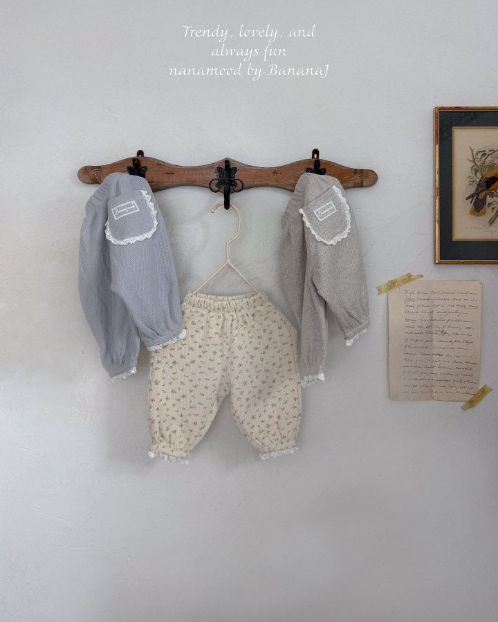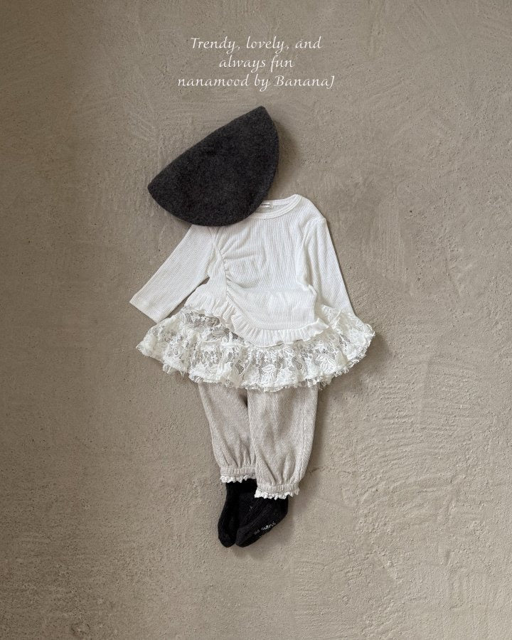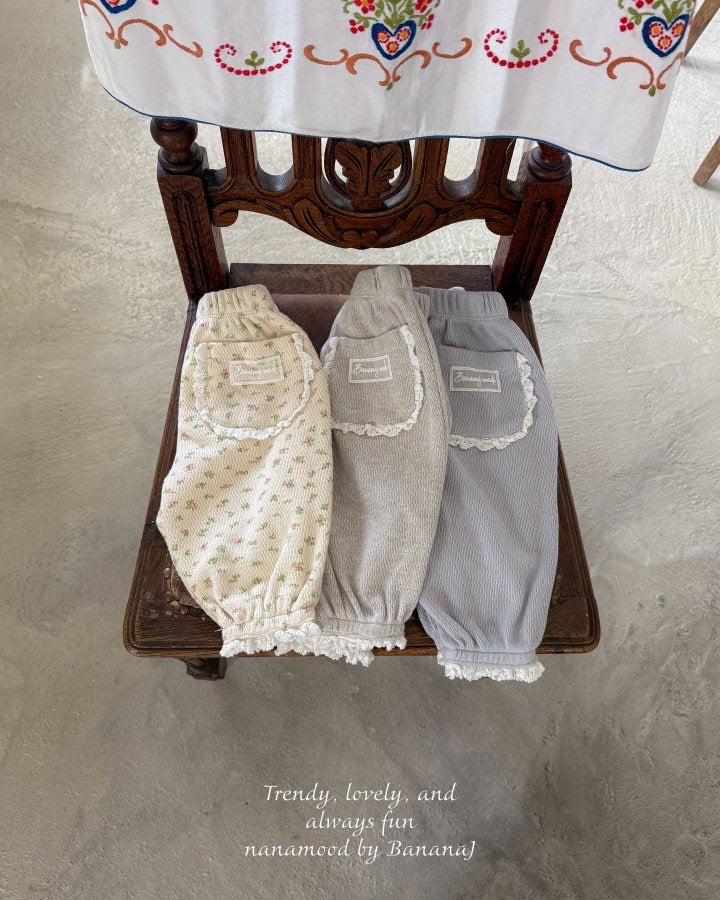 裾とポケットにレースをあしらったラブリーなベビーパンツ。