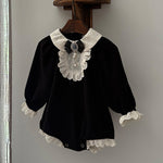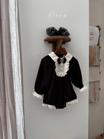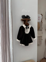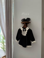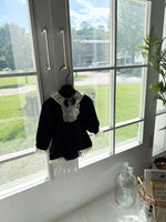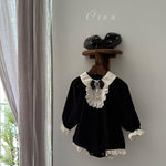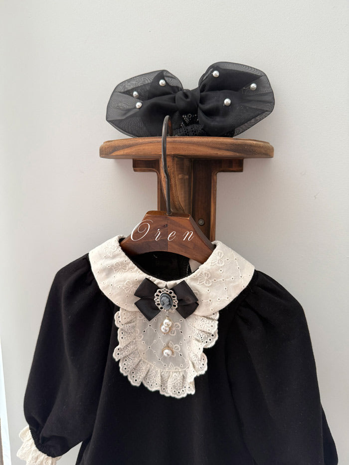 レースが重ねられた大きめのフリル襟が顔まわりを明るく、愛らしく引き立ててくれます。