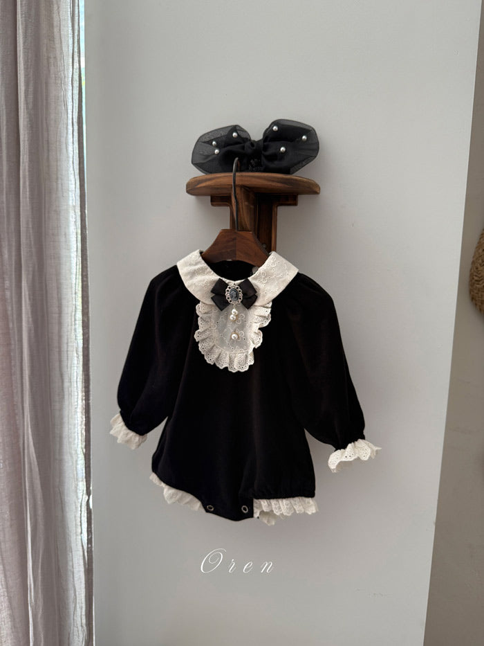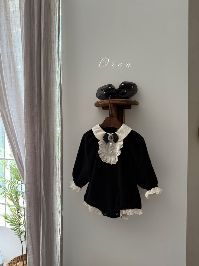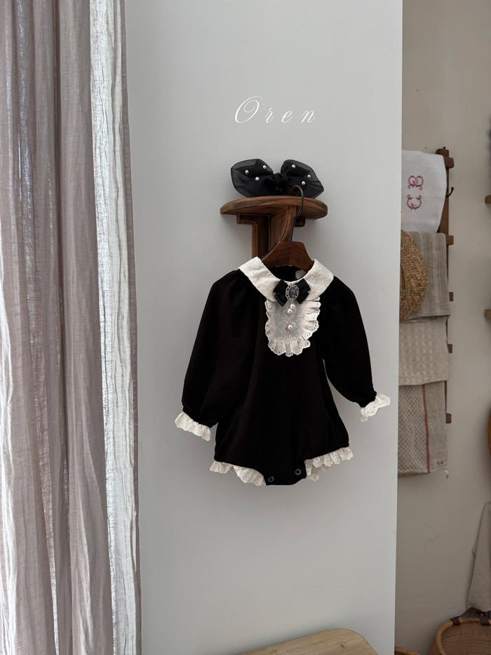 豊かなフリルカラーとパールブローチが際立つクラシカルなボディスーツ。