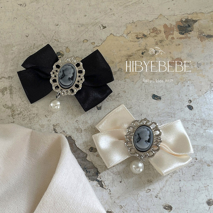 襟元には真珠のような飾りとリボンブローチがあしらわれており、