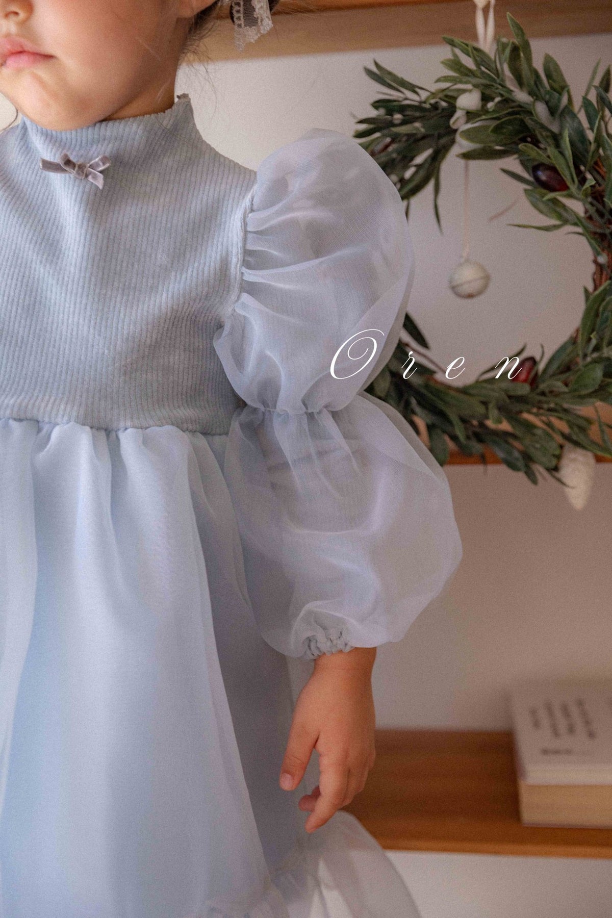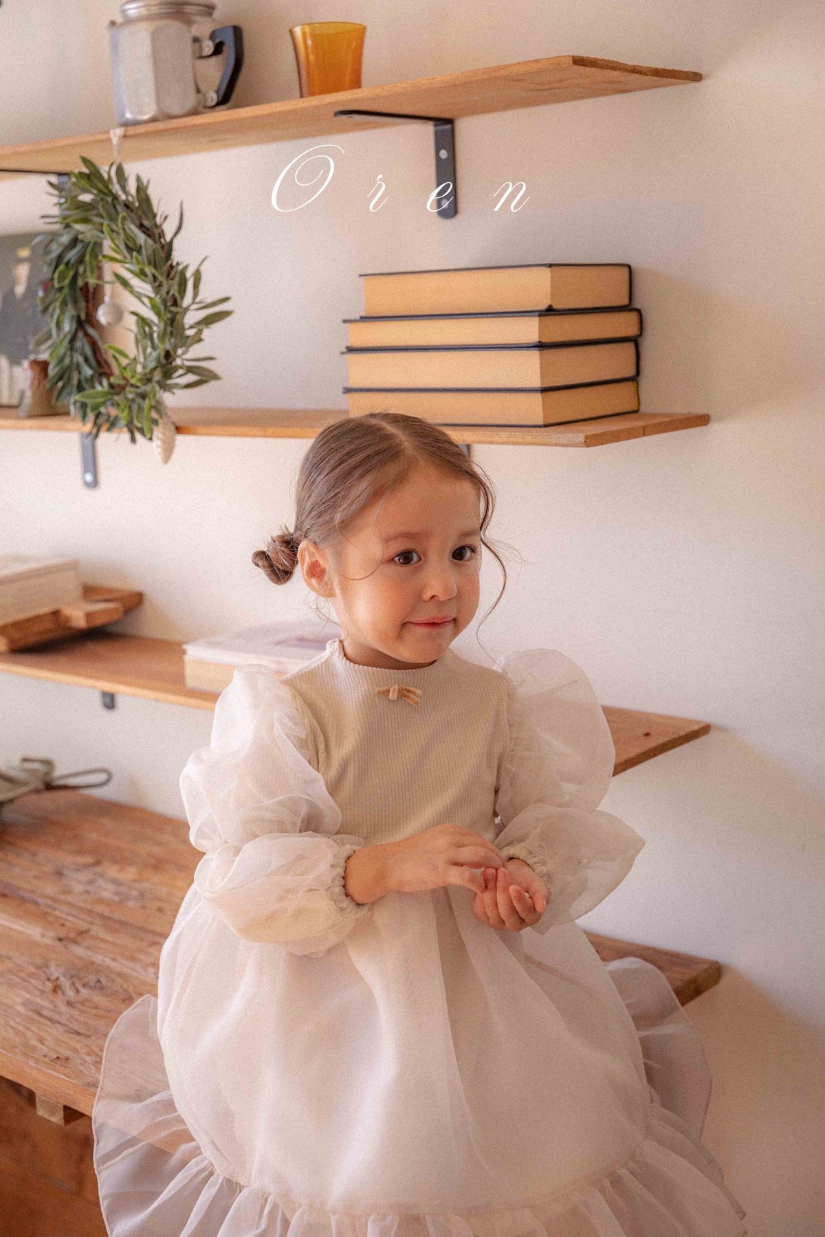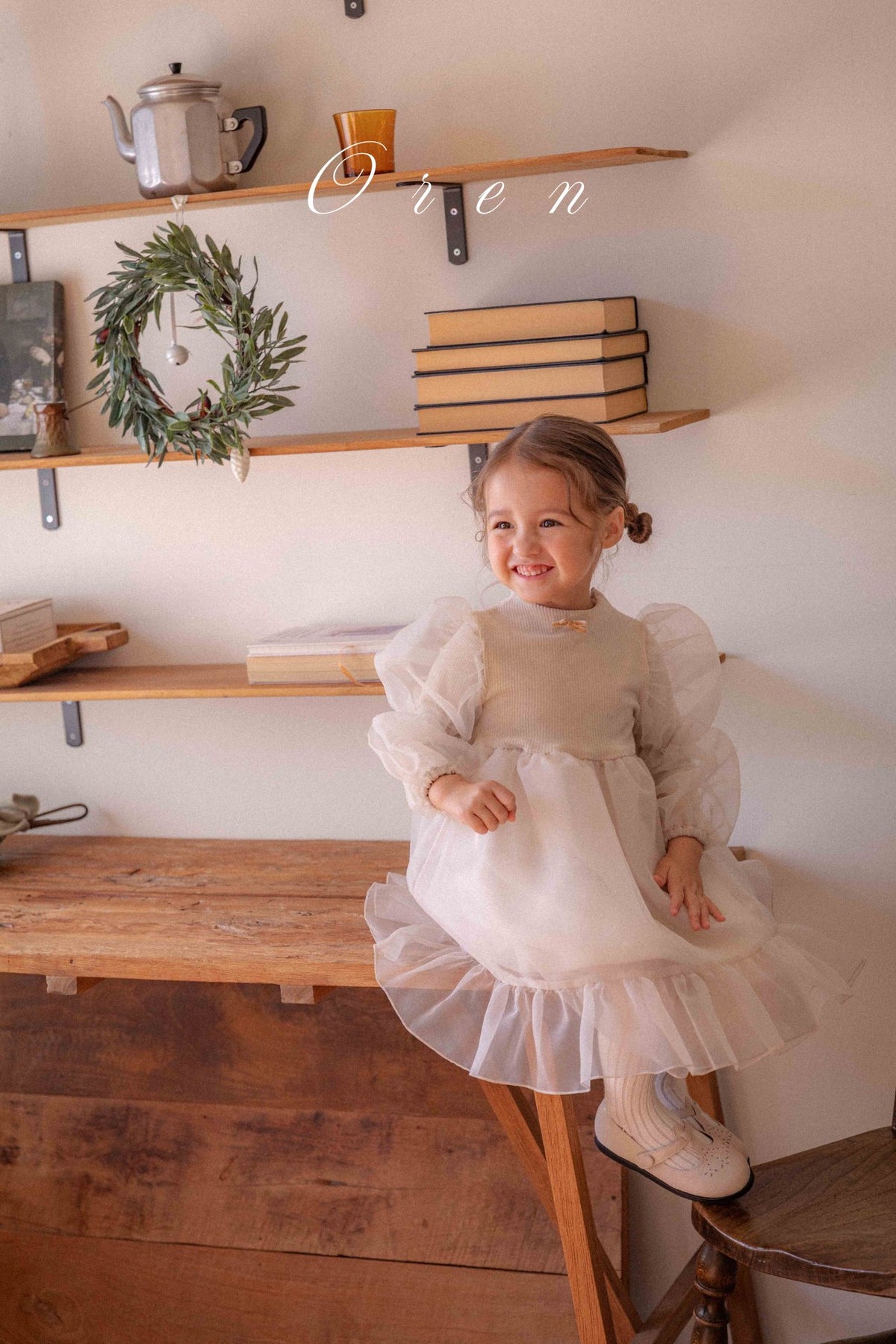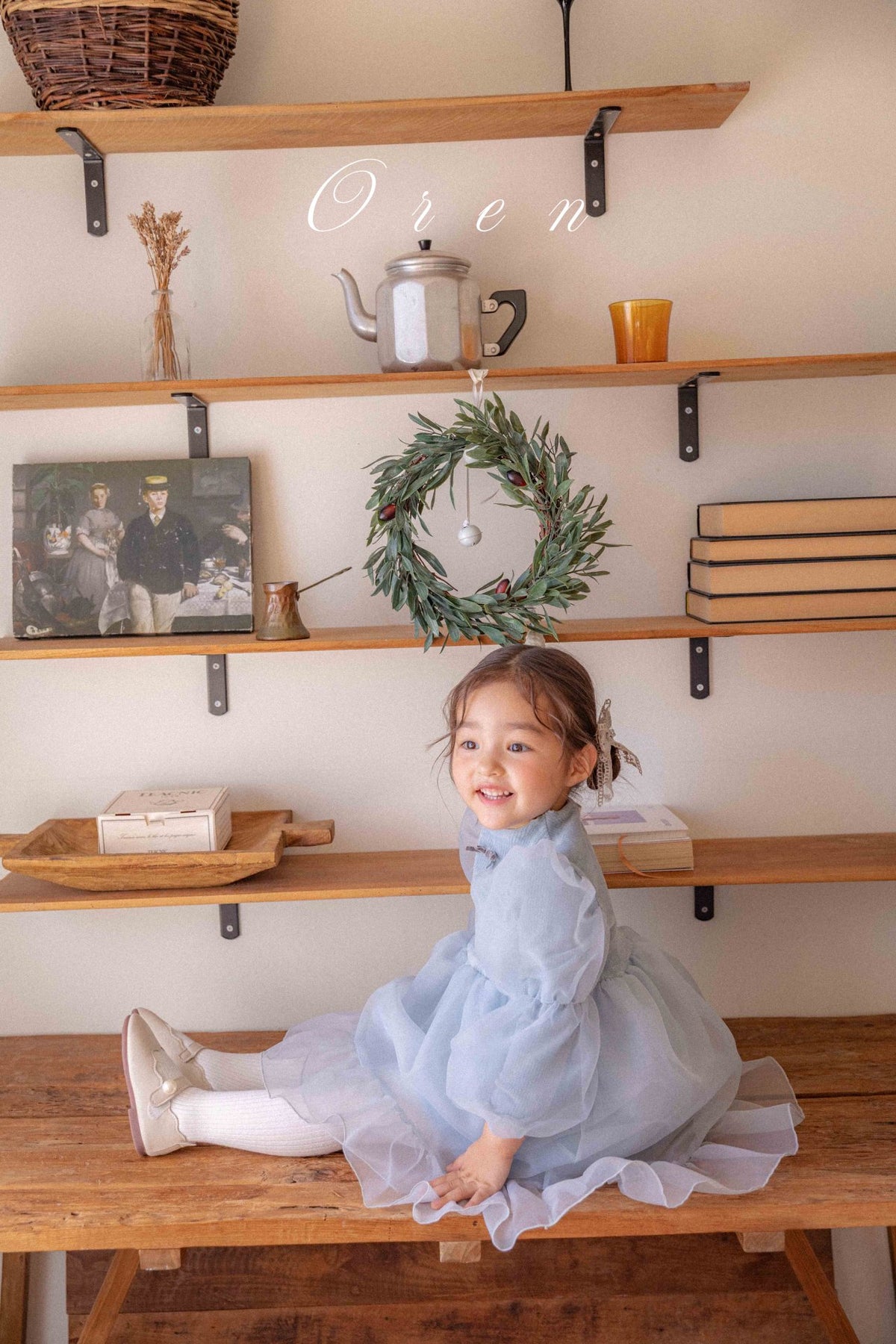 -柔らかなベルベット地の上に軽やかなオーガンジーを重ねた、上品で華やかなドレス。透明感のある質感が冬の光をやさしく反射し、ふんわりとしたぬくもりを感じさせます。パフスリーブとフリルミドル丈のボリュームあるシルエットが、動きに合わせて揺れるたびに愛らしさを演出。ネックラインには小さなベルベットリボンをあしらい、フレンチムード漂うエレガントな仕上がりに。ハリ感のある素材のためやや小さめのフィット感となっており、ワンサイズアップをおすすめします。
