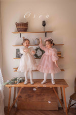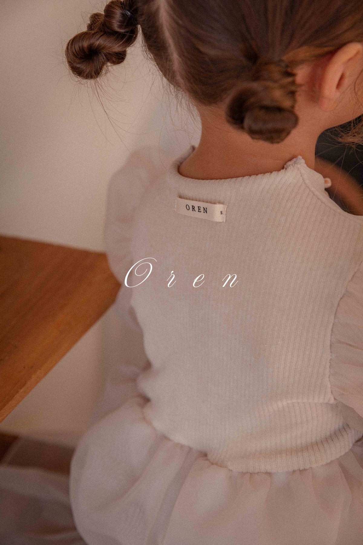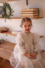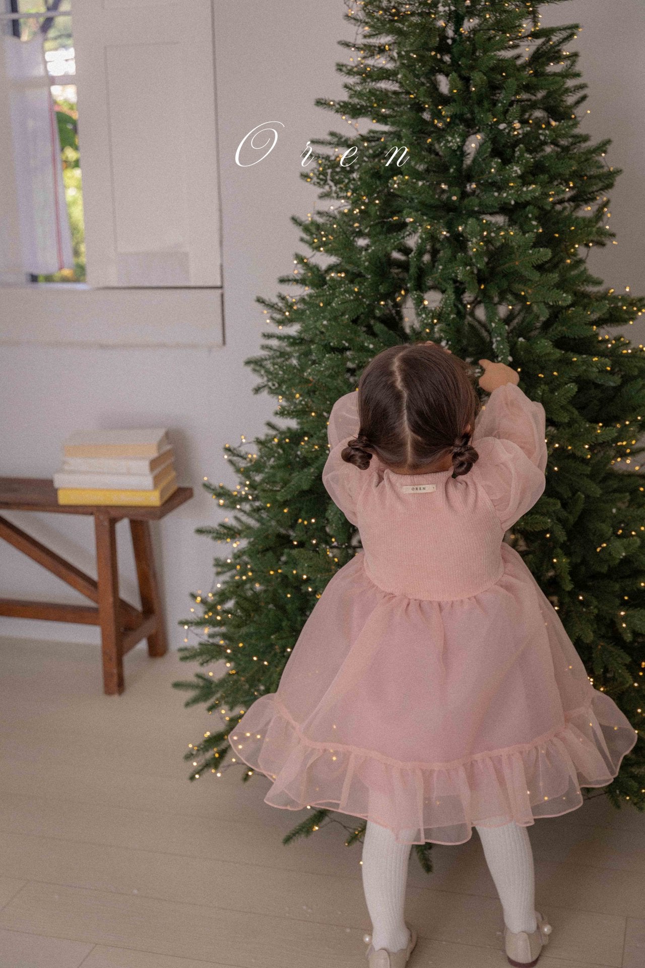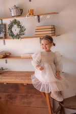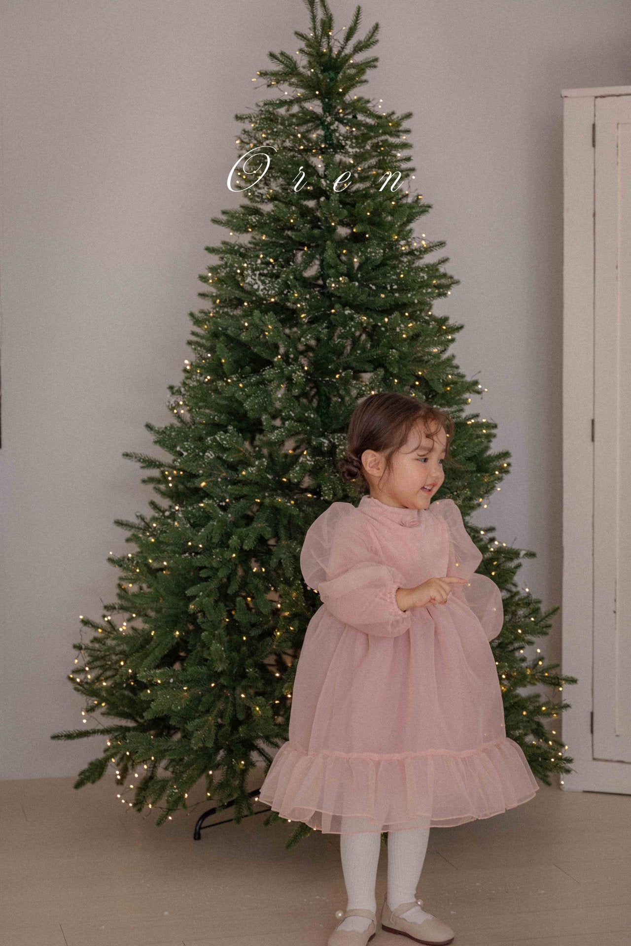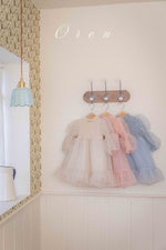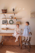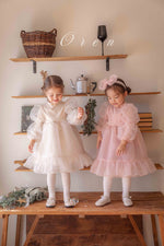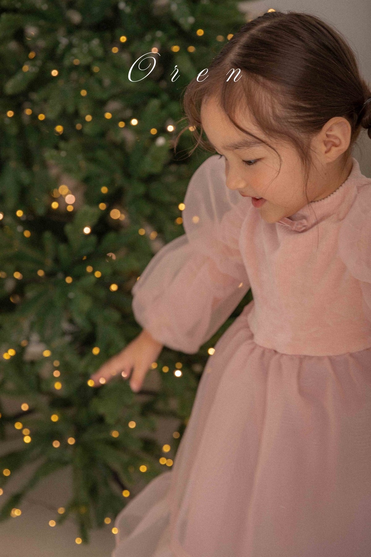 -柔らかなベルベット地の上に軽やかなオーガンジーを重ねた、上品で華やかなドレス。透明感のある質感が冬の光をやさしく反射し、ふんわりとしたぬくもりを感じさせます。パフスリーブとフリルミドル丈のボリュームあるシルエットが、動きに合わせて揺れるたびに愛らしさを演出。ネックラインには小さなベルベットリボンをあしらい、フレンチムード漂うエレガントな仕上がりに。ハリ感のある素材のためやや小さめのフィット感となっており、ワンサイズアップをおすすめします。