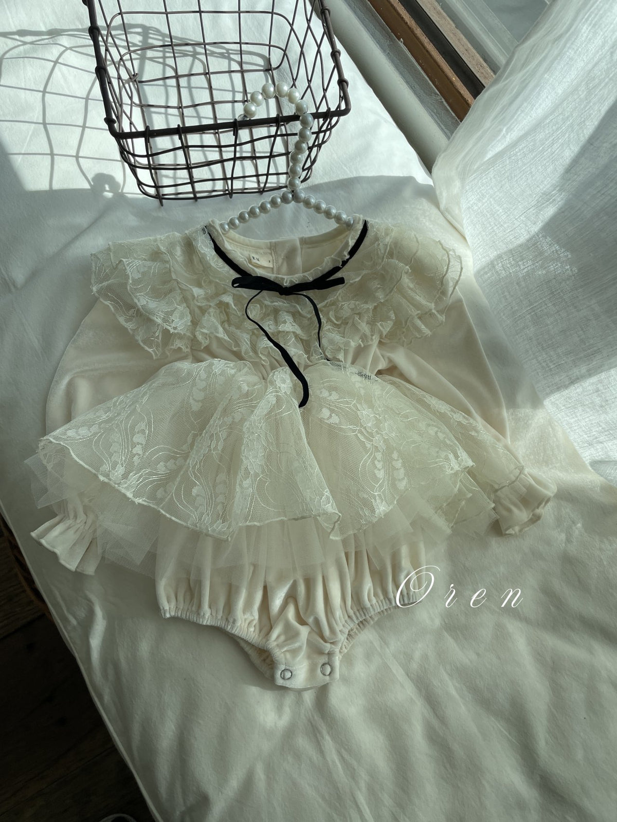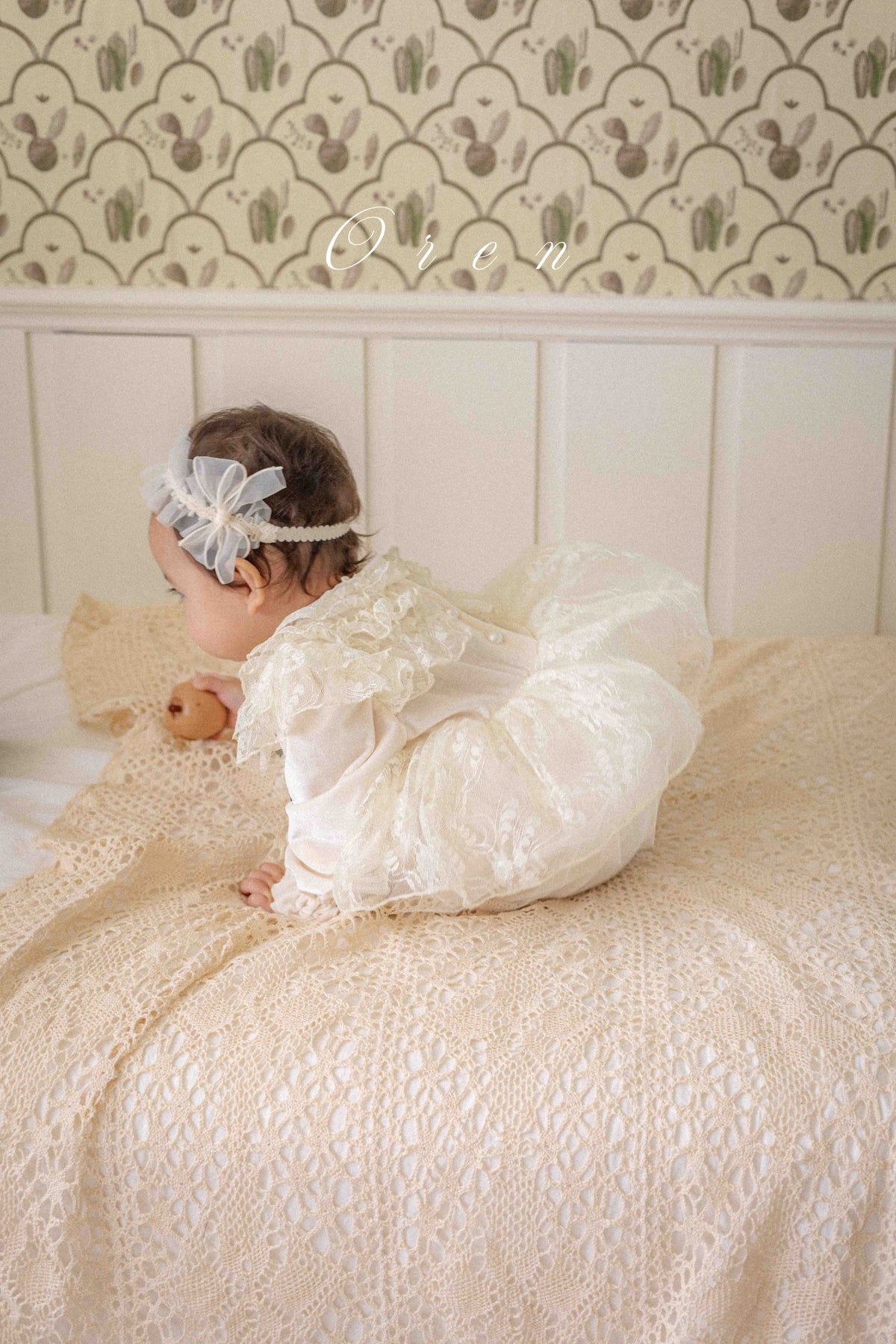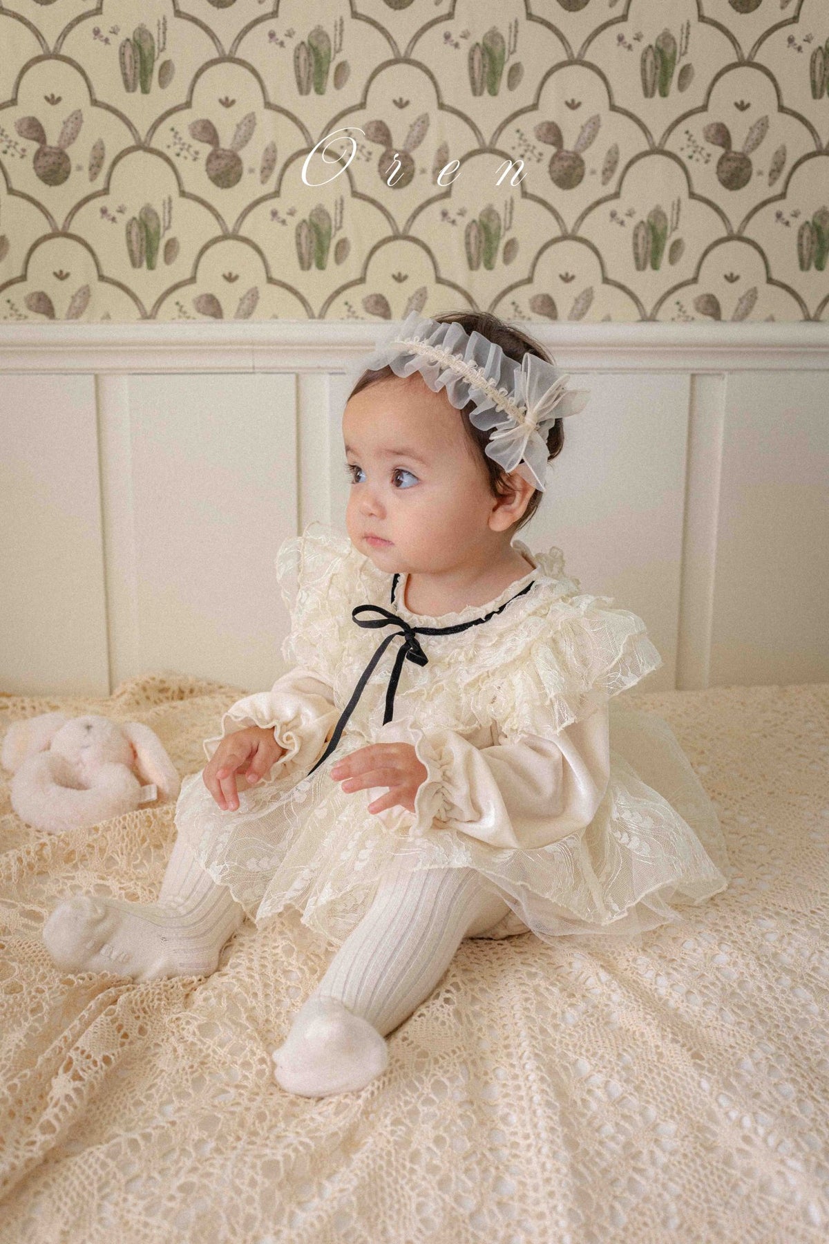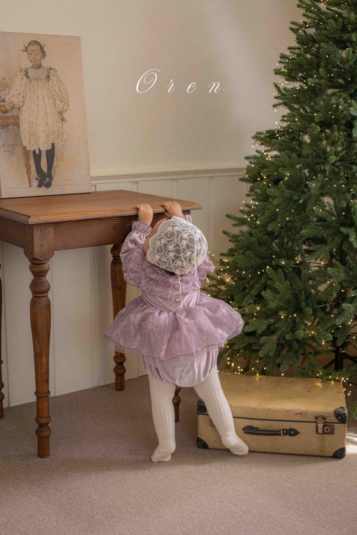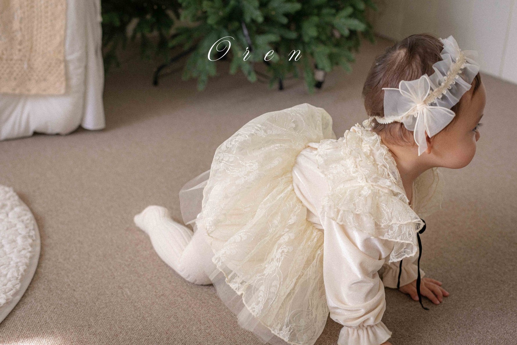 -上品なベルベットテクスチャーに、繊細なレースとチュールディテールを重ねたプレミアムスーツ。ふんわりとしたレースフリルとベルベットリボンが視線を惹きつけ、チュールスカートを重ねたボリューム感のあるシルエットが愛らしさを引き立てます。お宮参りやバースデー、記念撮影など特別な日にぴったりのフォーマルウェアです。
