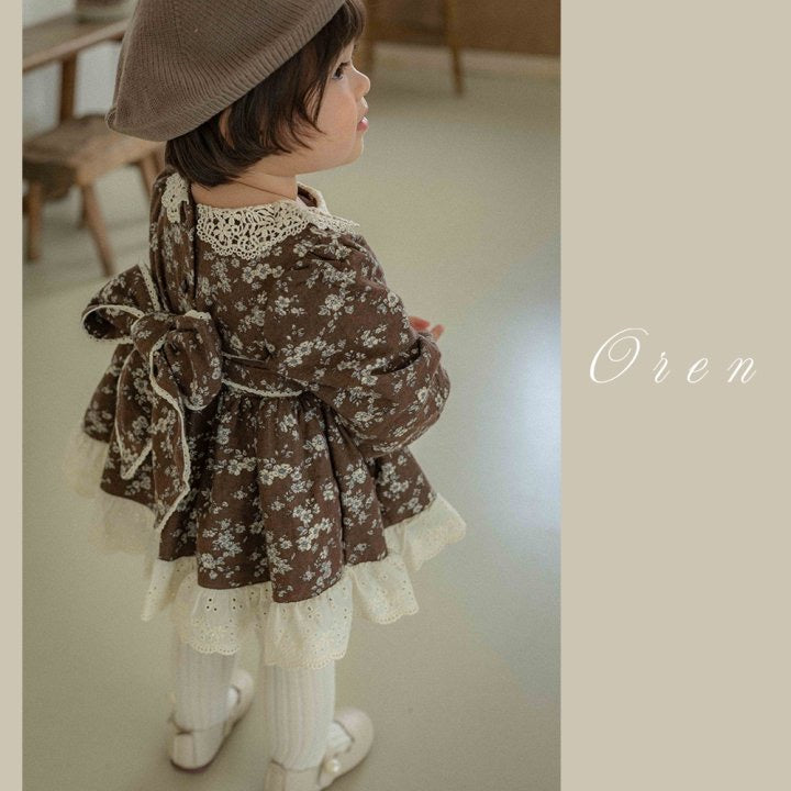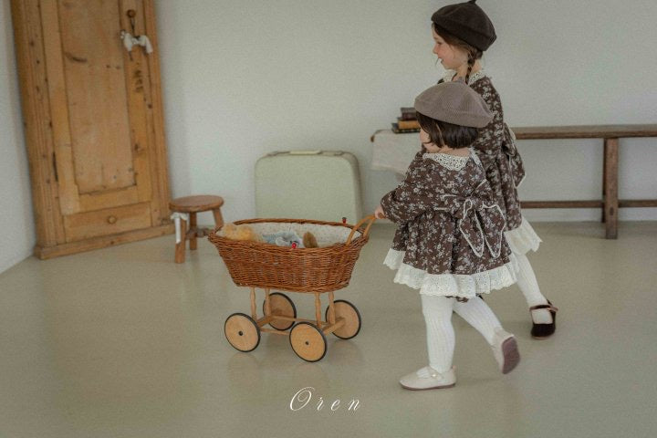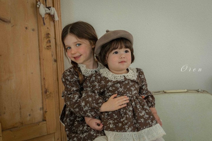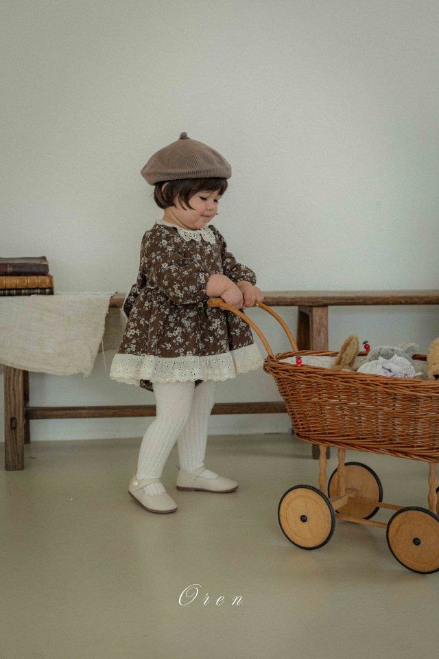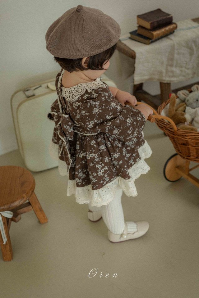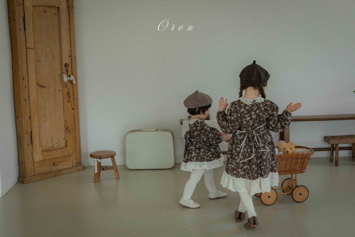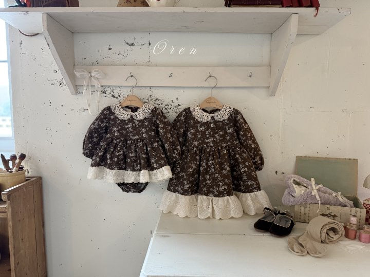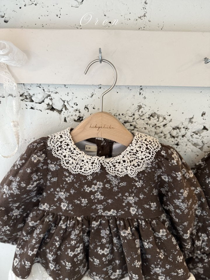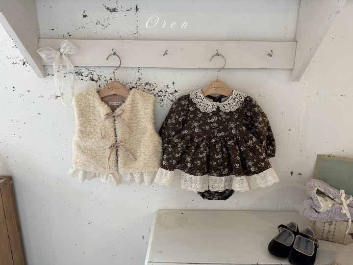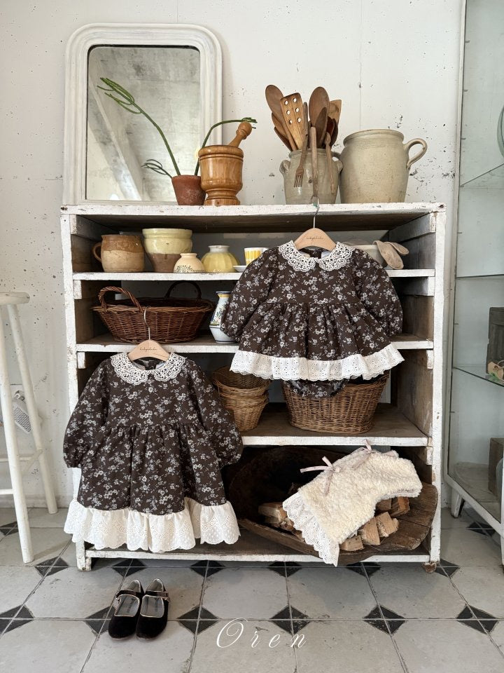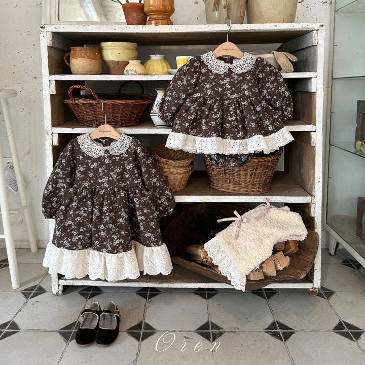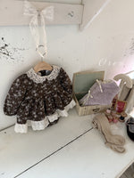 クラシックな感性と可愛らしさを兼ね備えた1オンスパディングブルマ。 軽量で保温性のある中綿で、寒い日も快適。 ブラウン地に小花柄、レースの襟と裾のアイレットフリルがフレンチな印象。