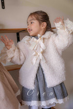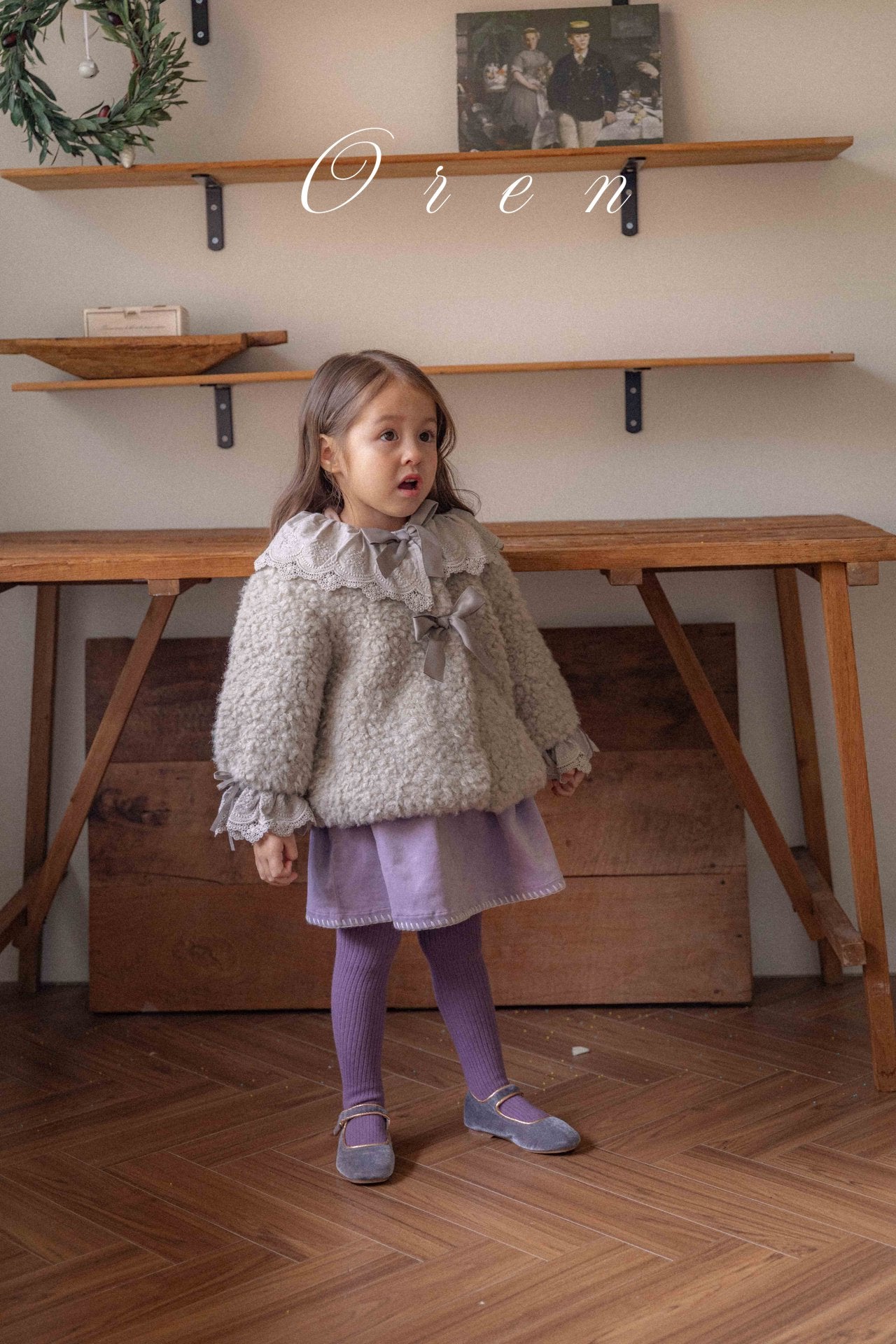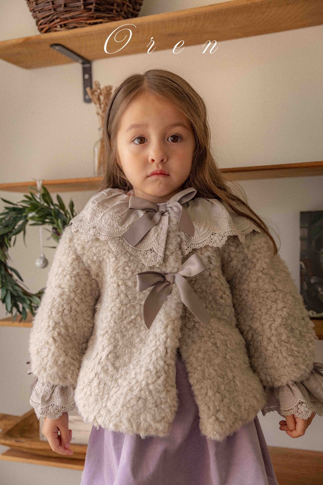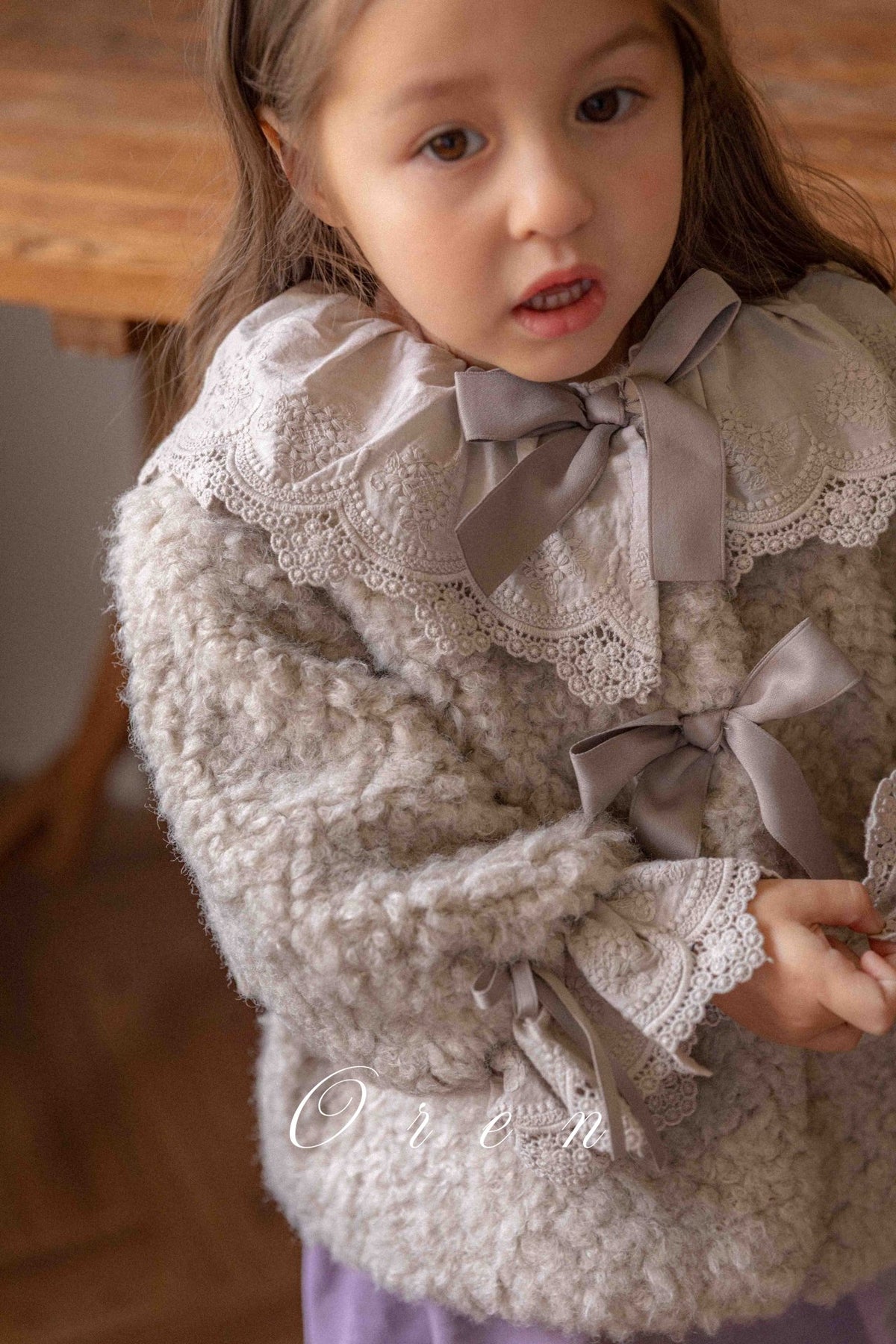 -ふんわりとしたテクスチャのボア素材に、繊細なレースカラーとリボンディテールをあしらった、ORENのロマンティックな冬のアウター。柔らかな起毛感のあるボア生地とレースの曲線が調和し、あたたかく上品な雰囲気を演出します。襟元と袖口にはクラシックな刺繍レースとリボンをあしらい、特別感のあるポイントに。ドレスやニットの上に軽く羽織るだけで、愛らしさと上品さを兼ね備えたスタイルが完成します。寒い季節をあたたかく包み込みながら、美しさとやさしさを感じさせる一着です。