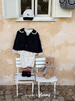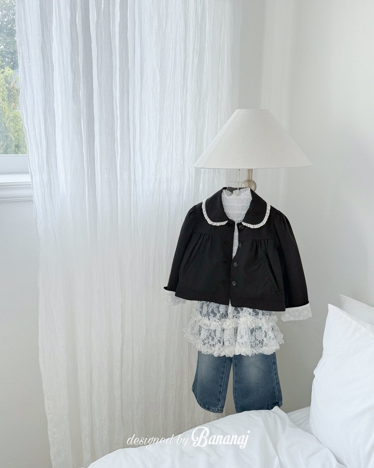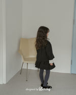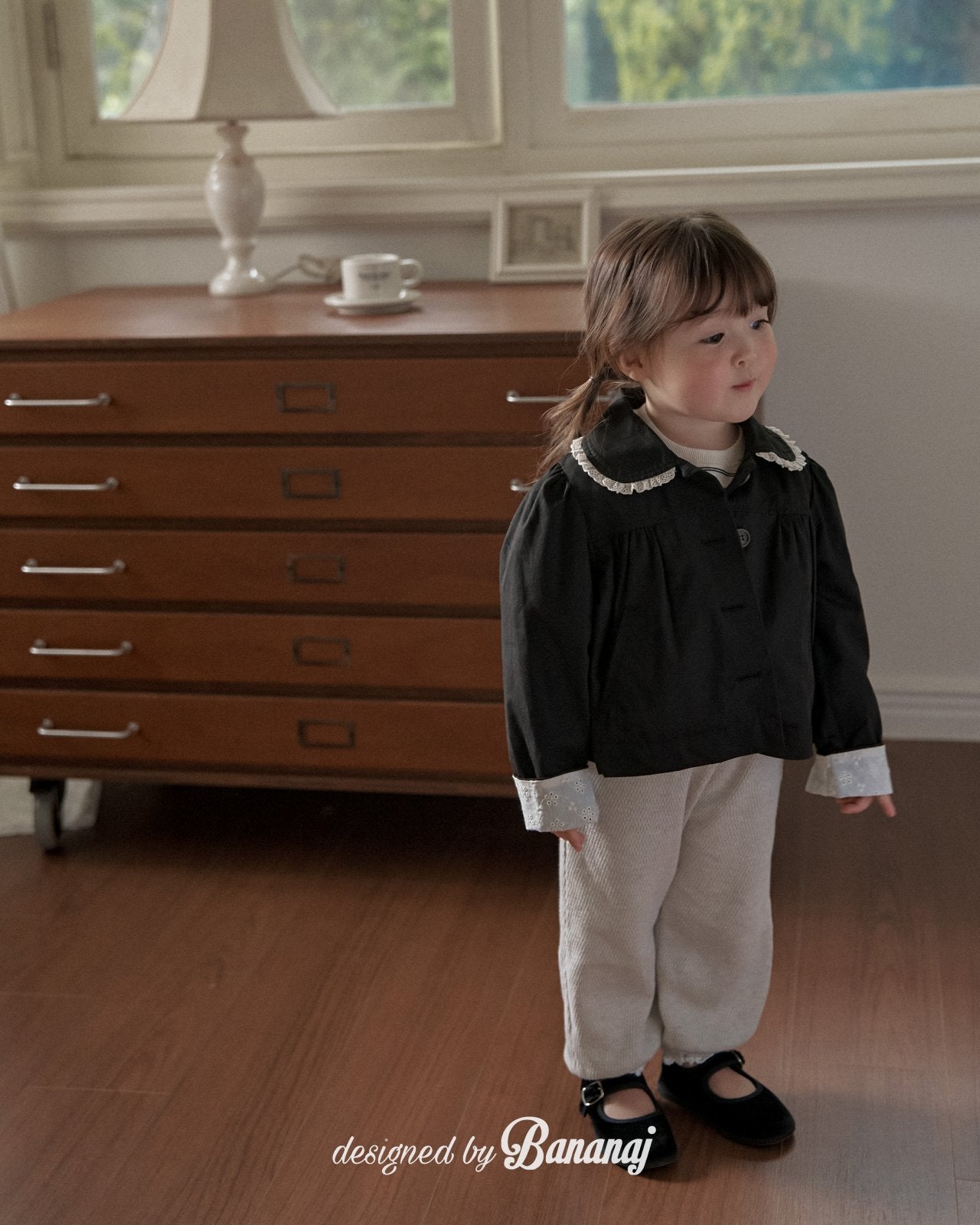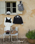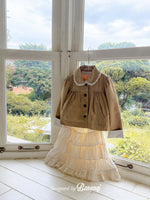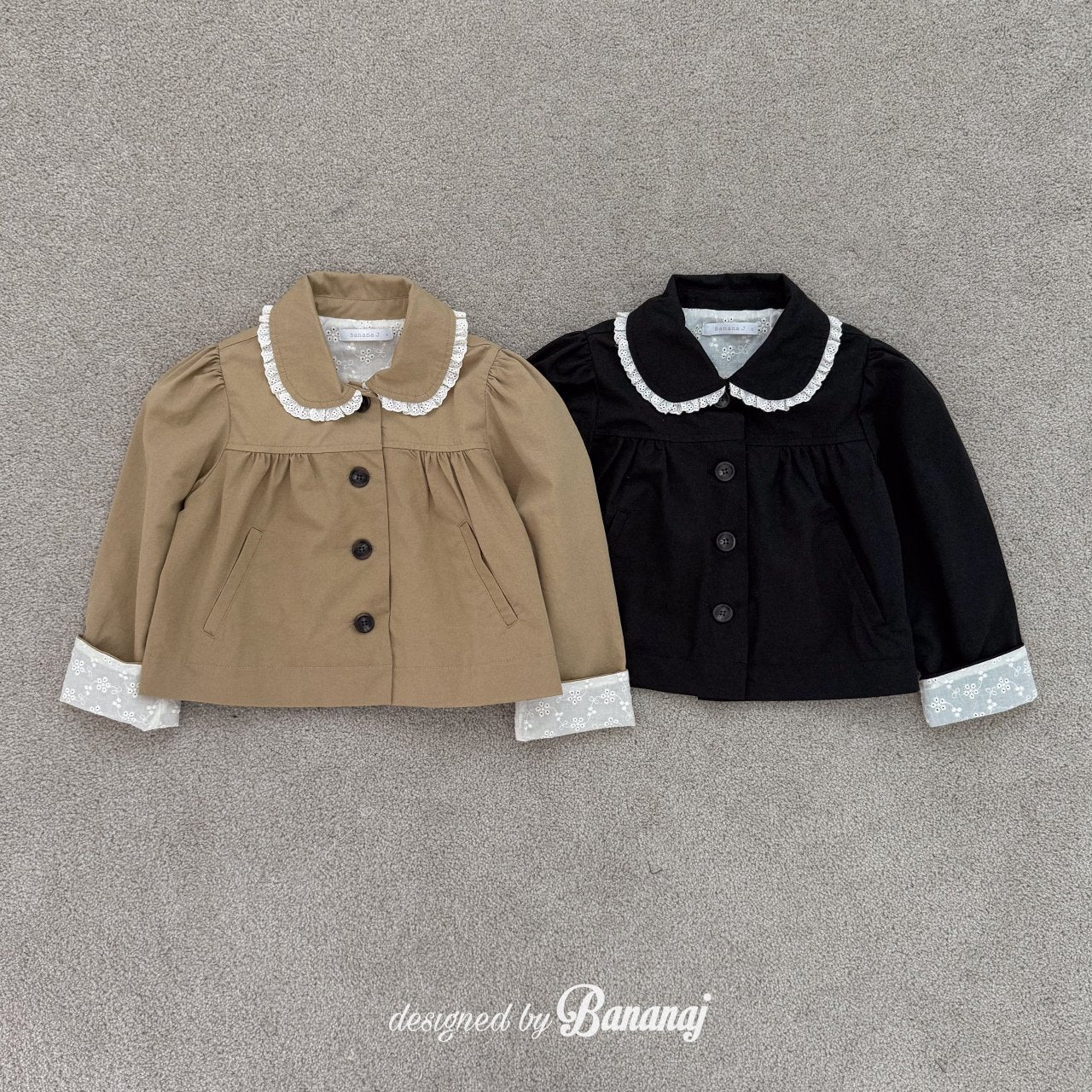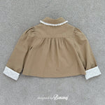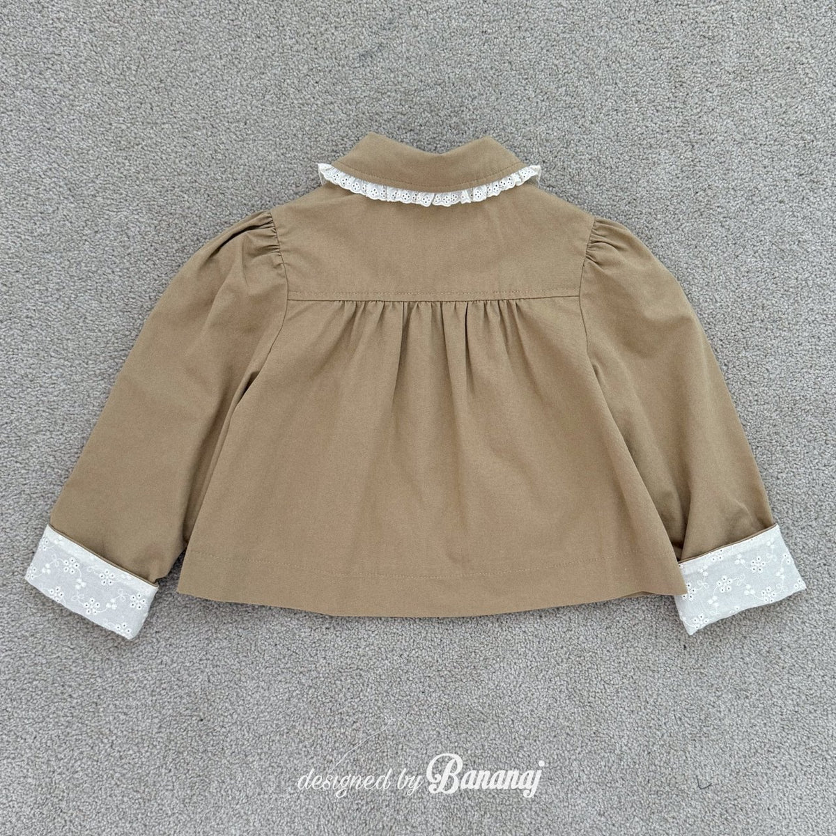 丸い襟にレーストリミングでポイントを加え、カフスの内側にも繊細なレースディテールをあしらいました。背面にギャザーを寄せたAラインシルエットで、きちんと感がありながらも可愛らしい雰囲気を演出します。ワンピースやパンツの上から軽く羽織るのにぴったりで、ショート丈なので動きやすく、お子さまも快適に着られます。