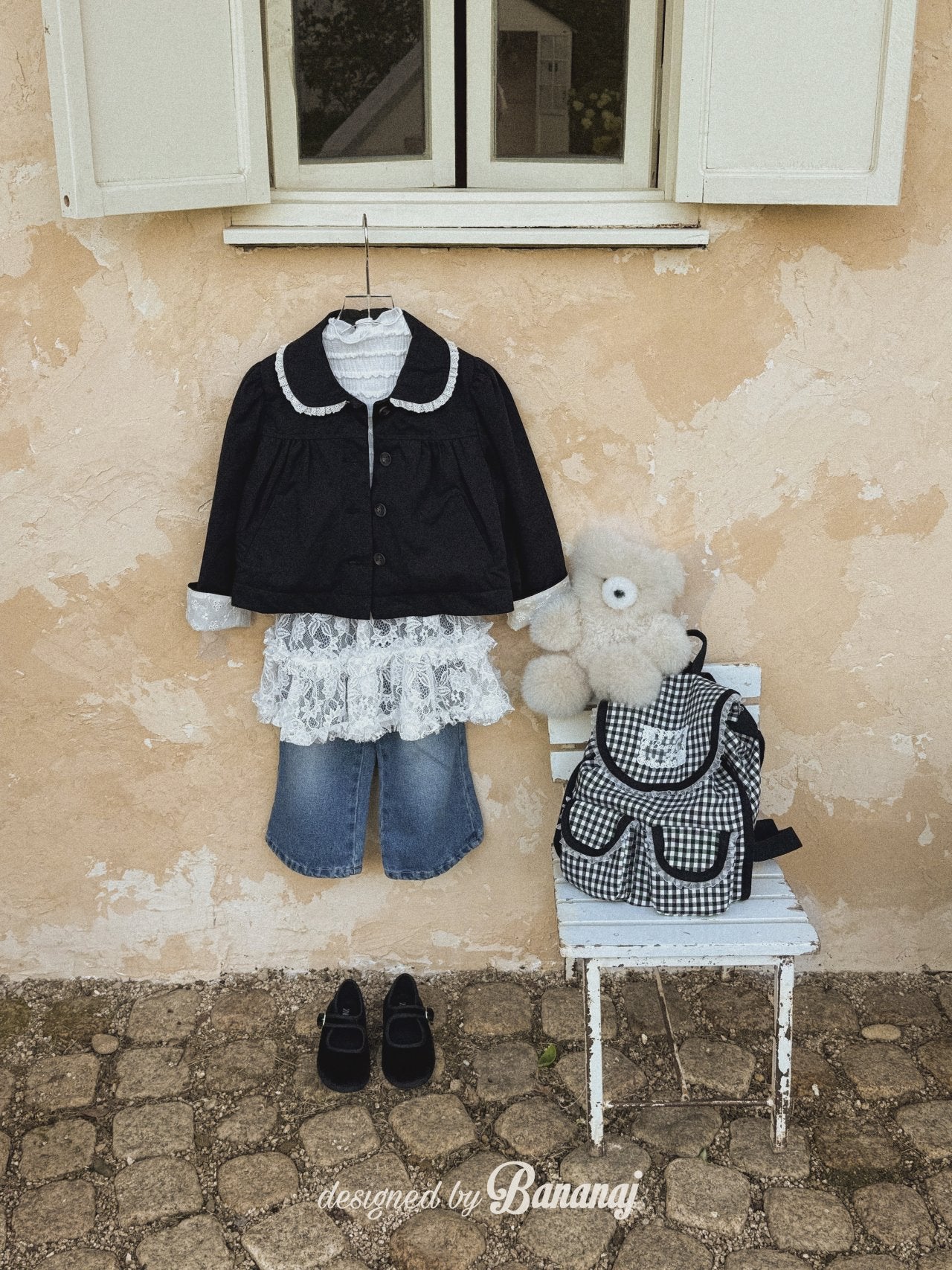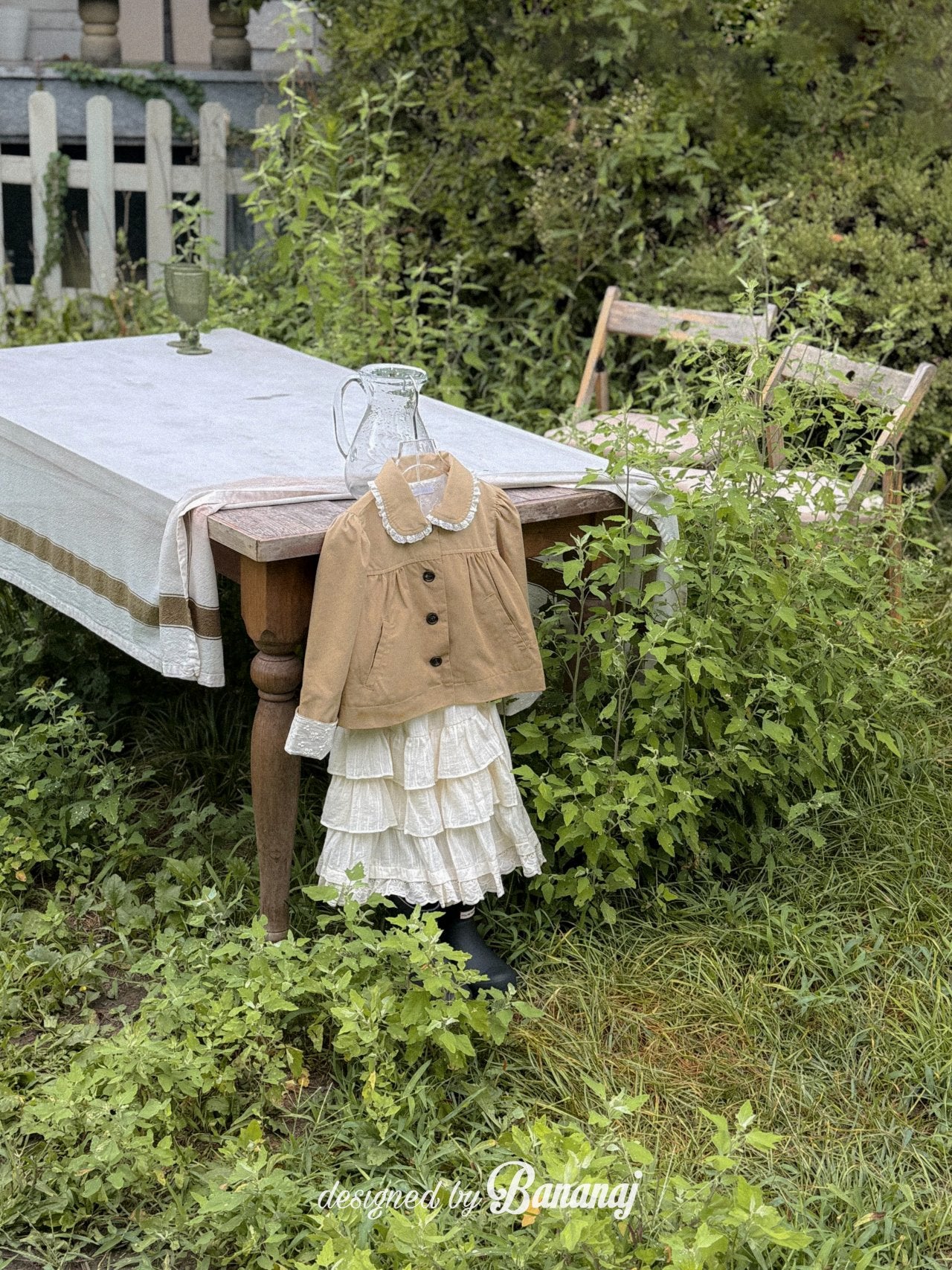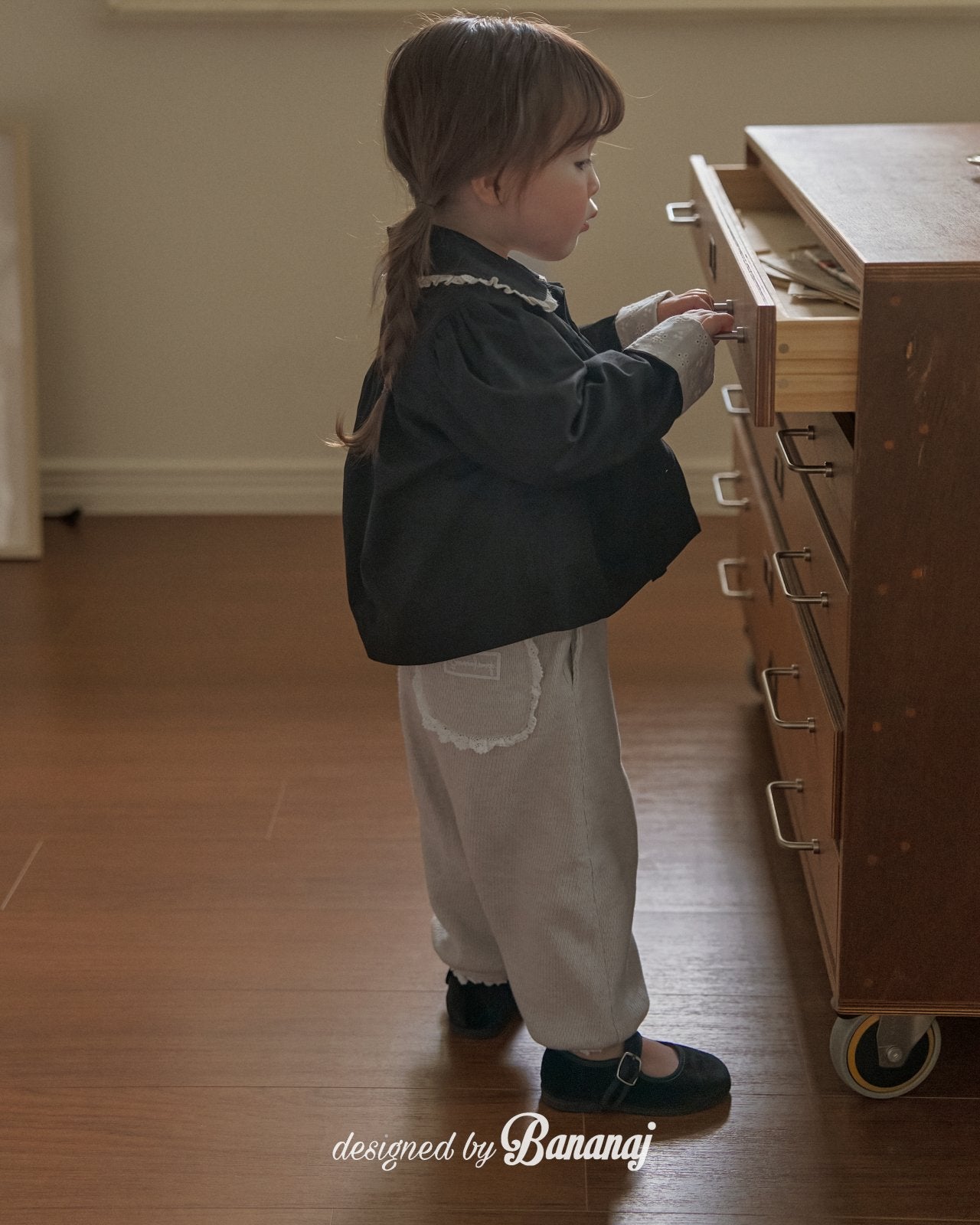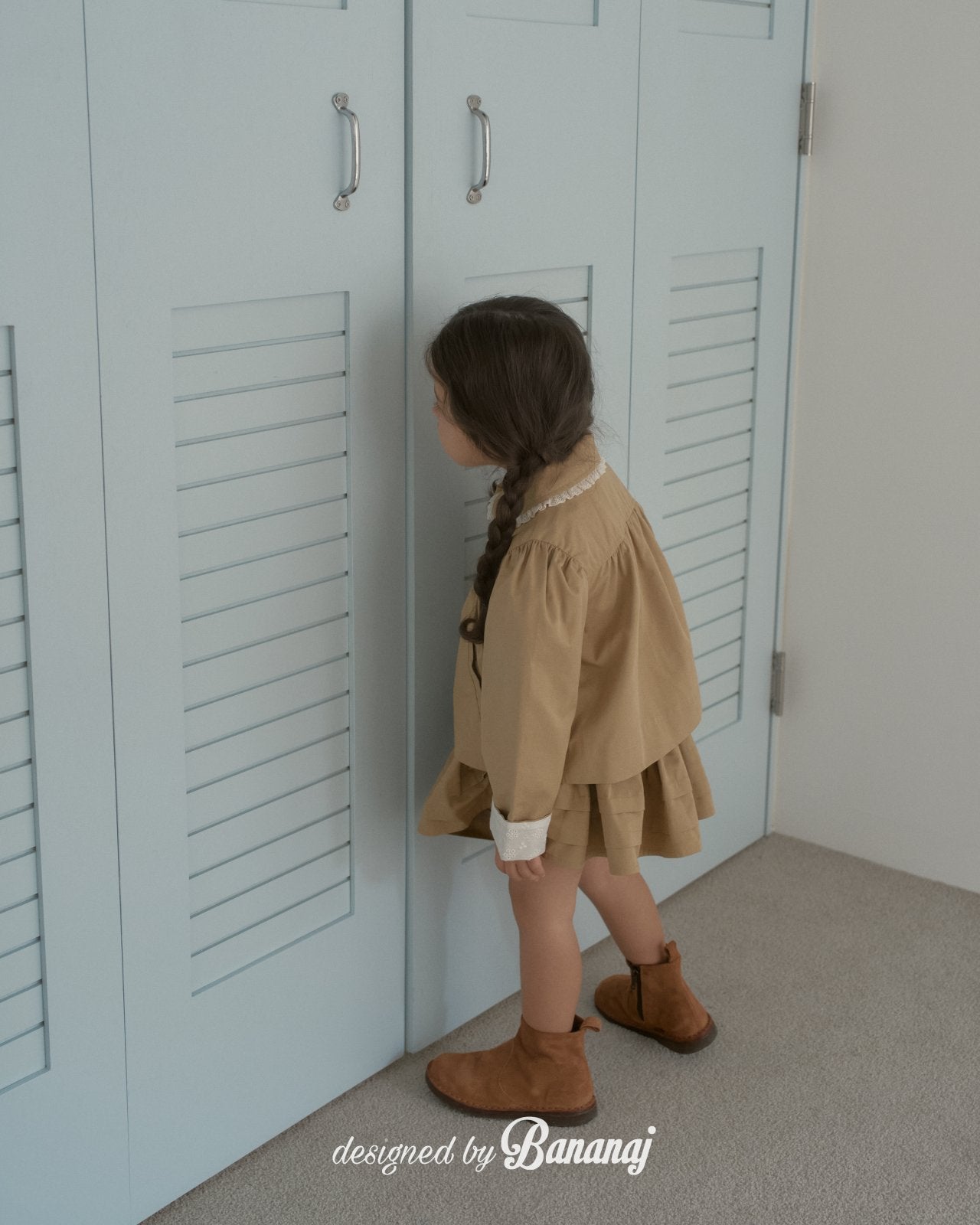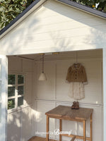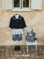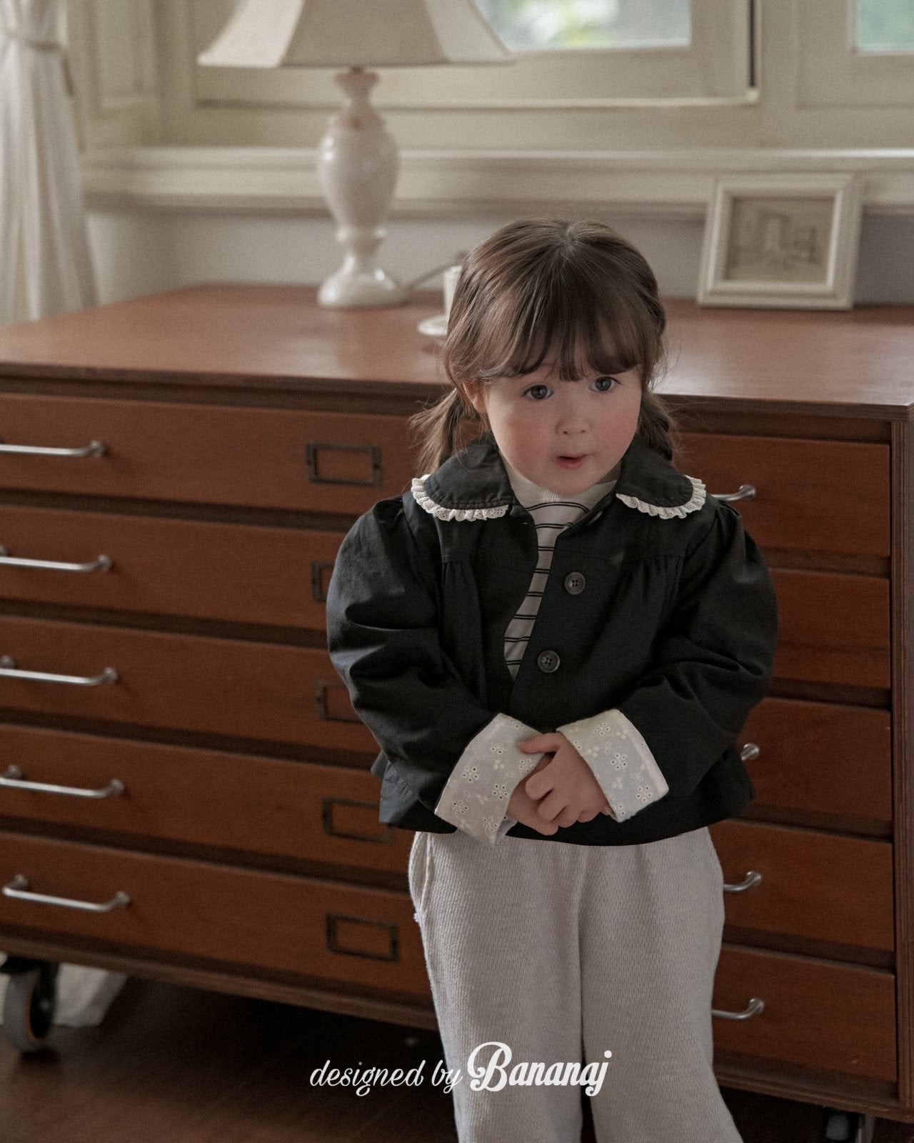 丸い襟にレーストリミングでポイントを加え、カフスの内側にも繊細なレースディテールをあしらいました。背面にギャザーを寄せたAラインシルエットで、きちんと感がありながらも可愛らしい雰囲気を演出します。ワンピースやパンツの上から軽く羽織るのにぴったりで、ショート丈なので動きやすく、お子さまも快適に着られます。