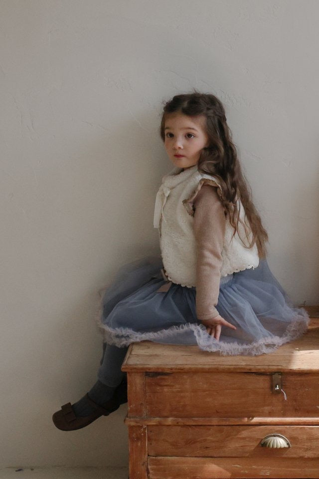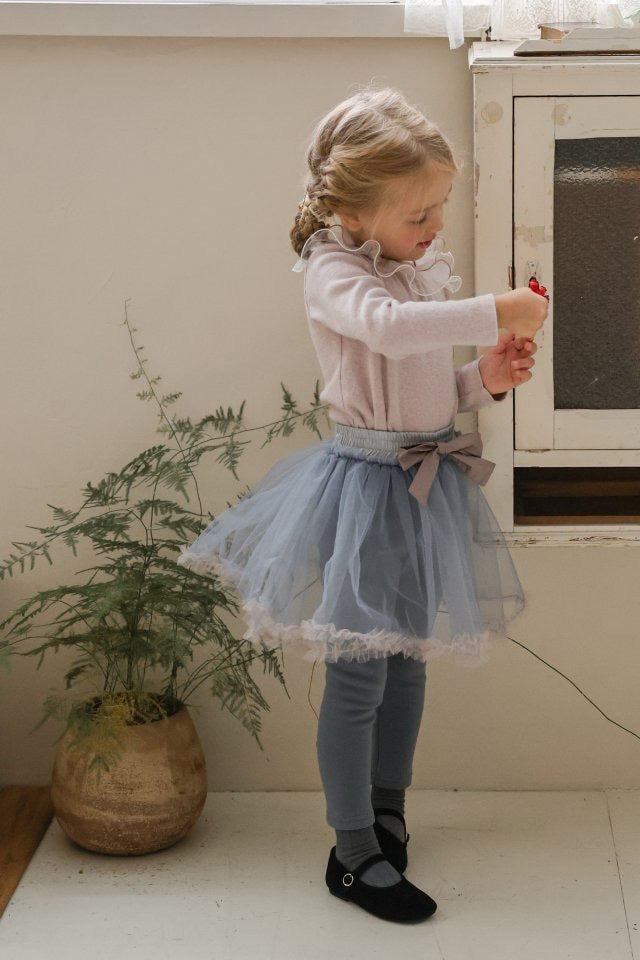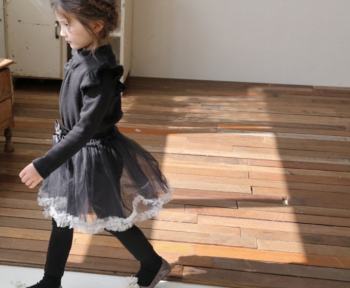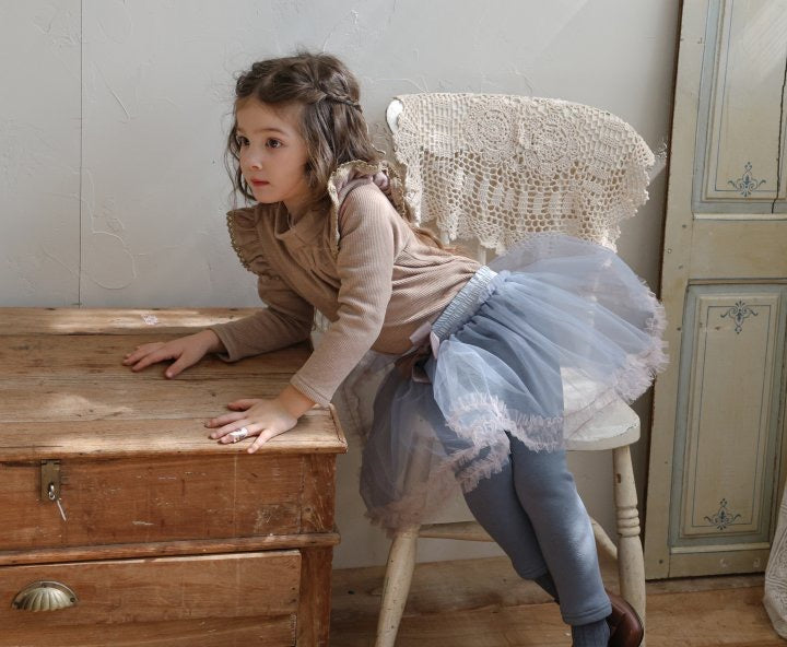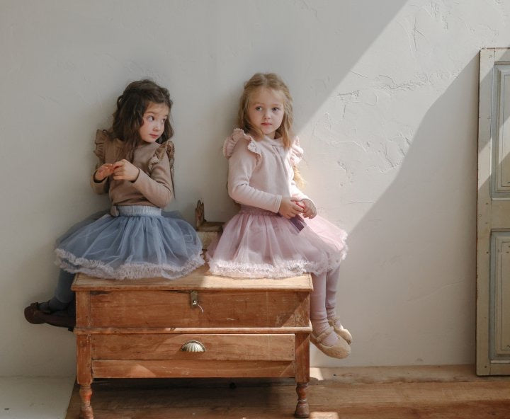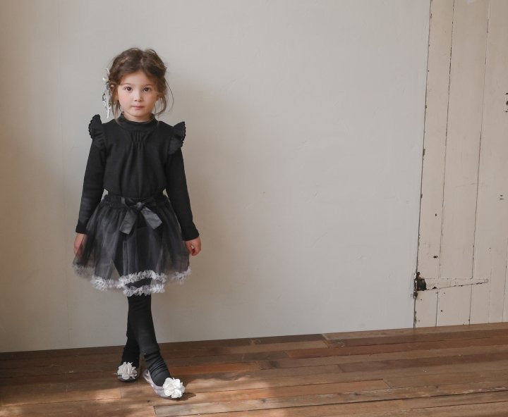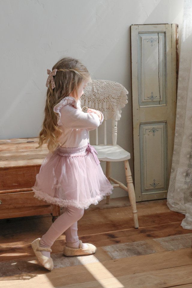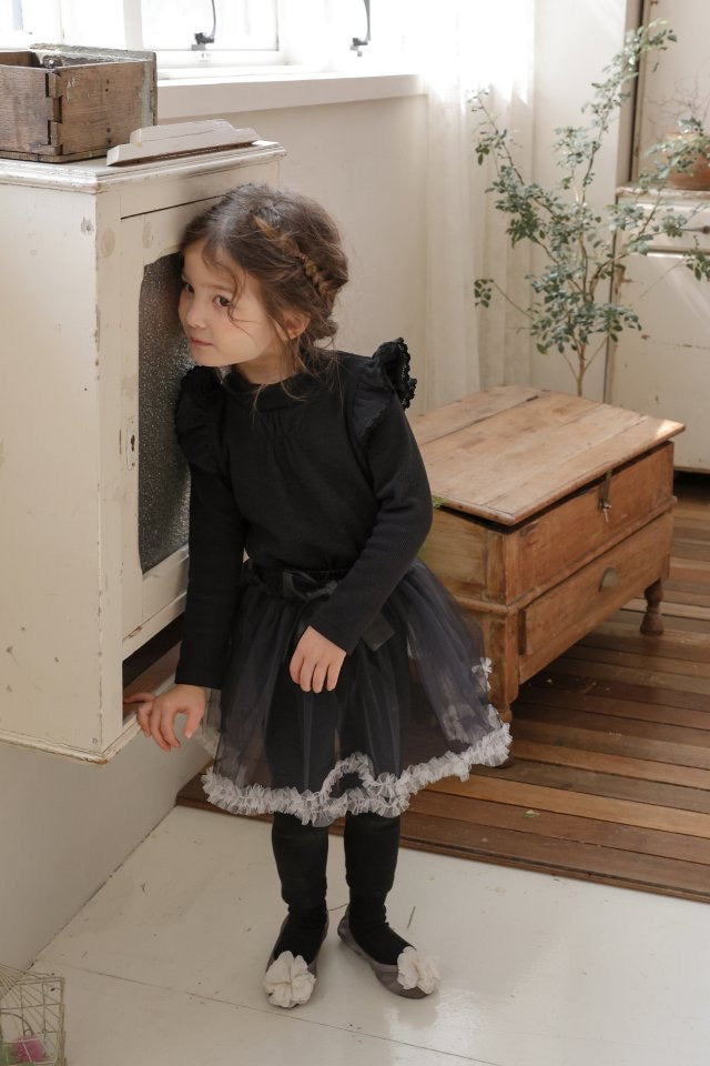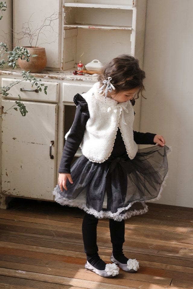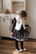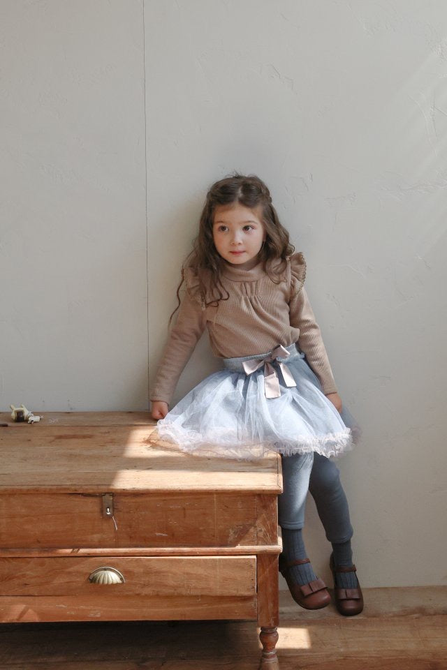チュールのチュチュスカートがロマンティックなムードを引き立て、裾のフリルディテールがふんわり感と愛らしさをプラスします。