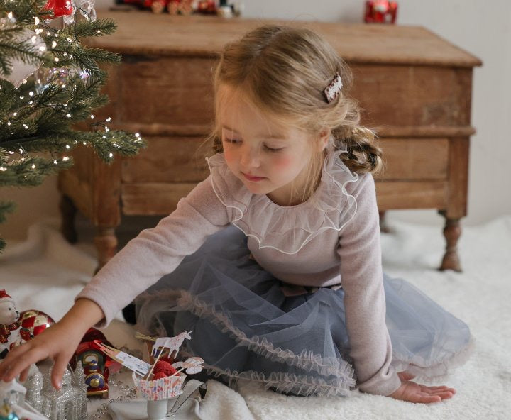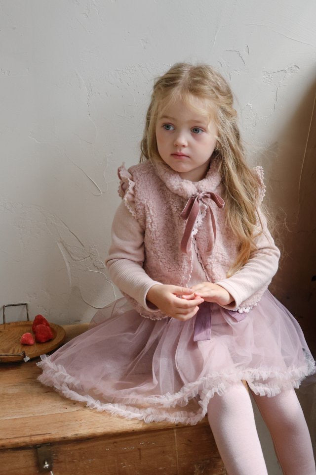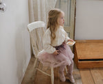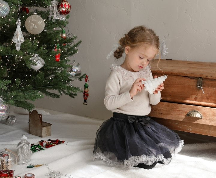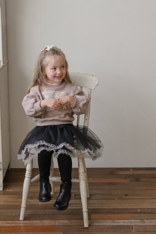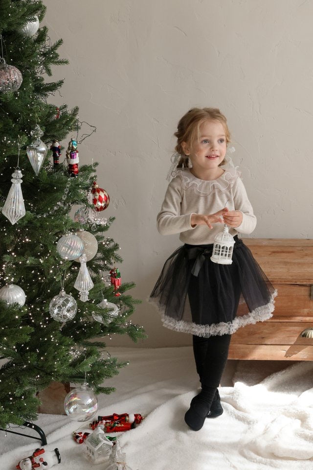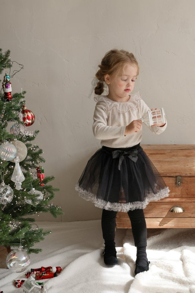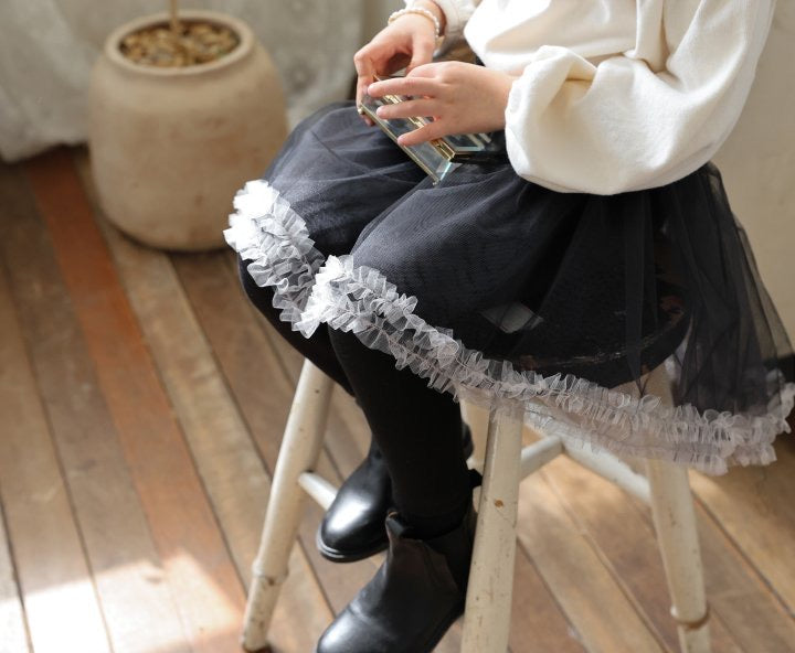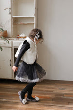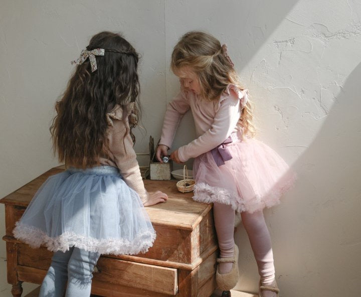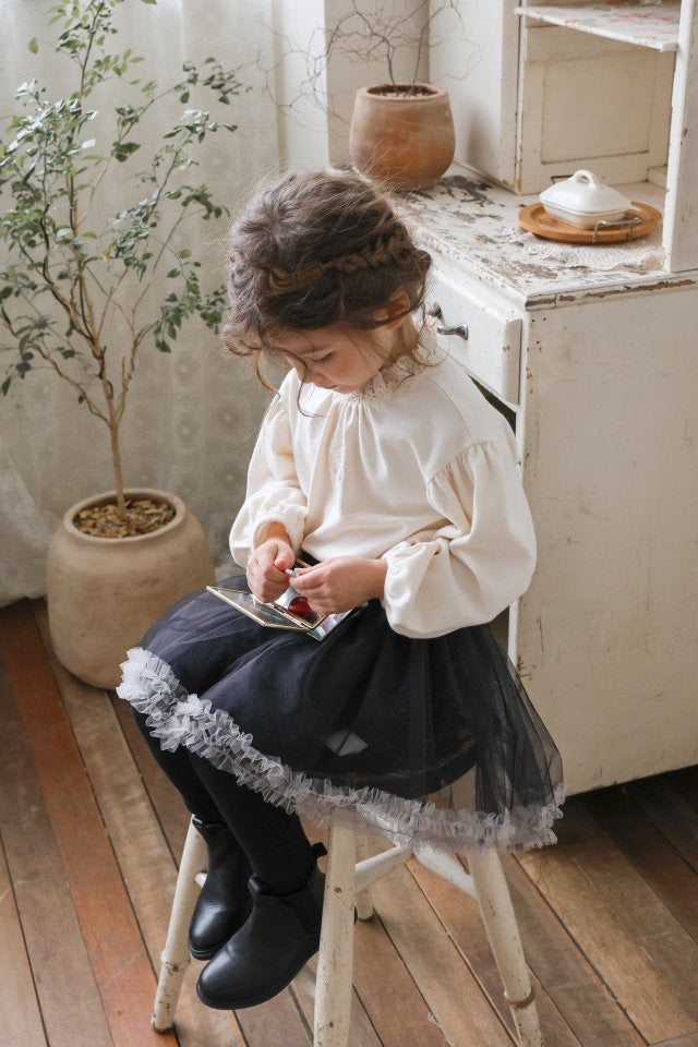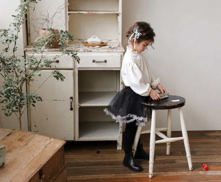 チュールのチュチュスカートがロマンティックなムードを引き立て、裾のフリルディテールがふんわり感と愛らしさをプラスします。