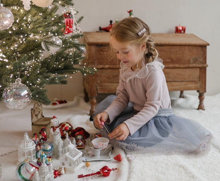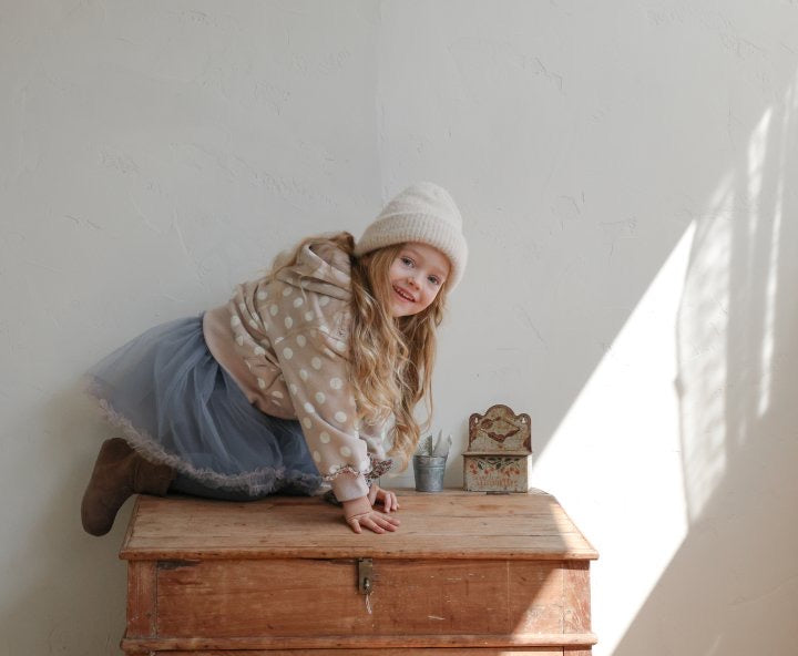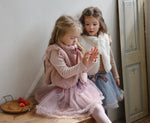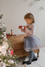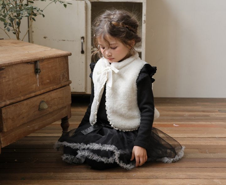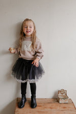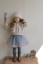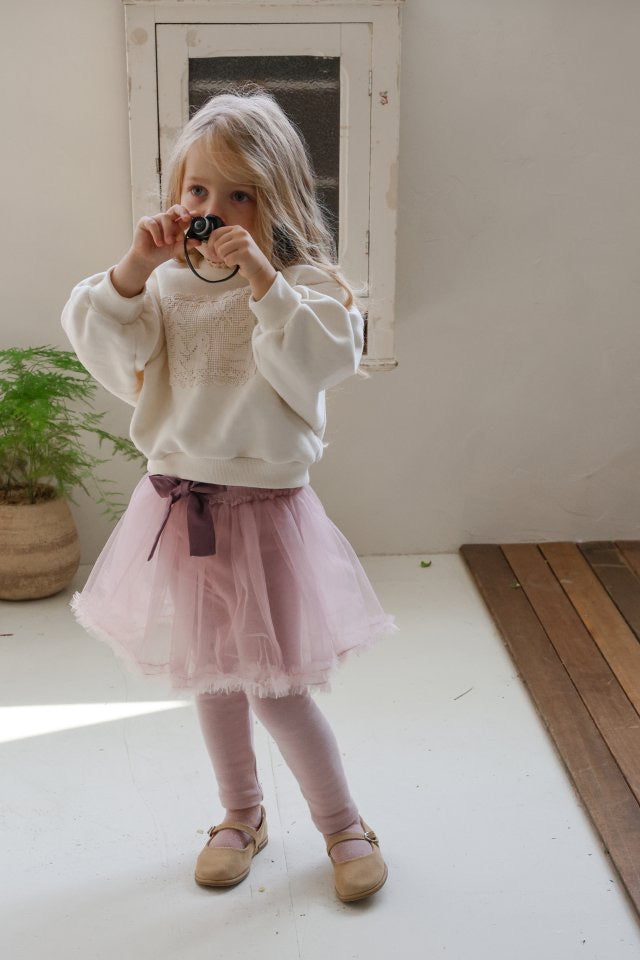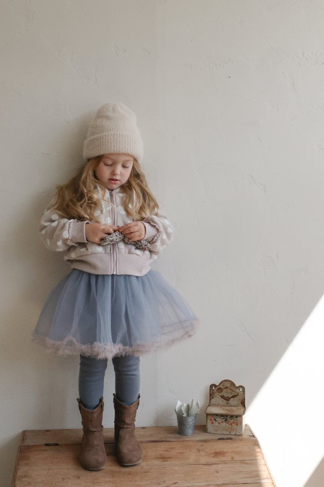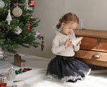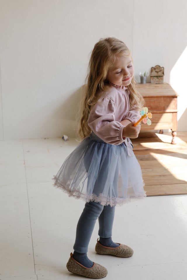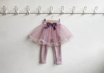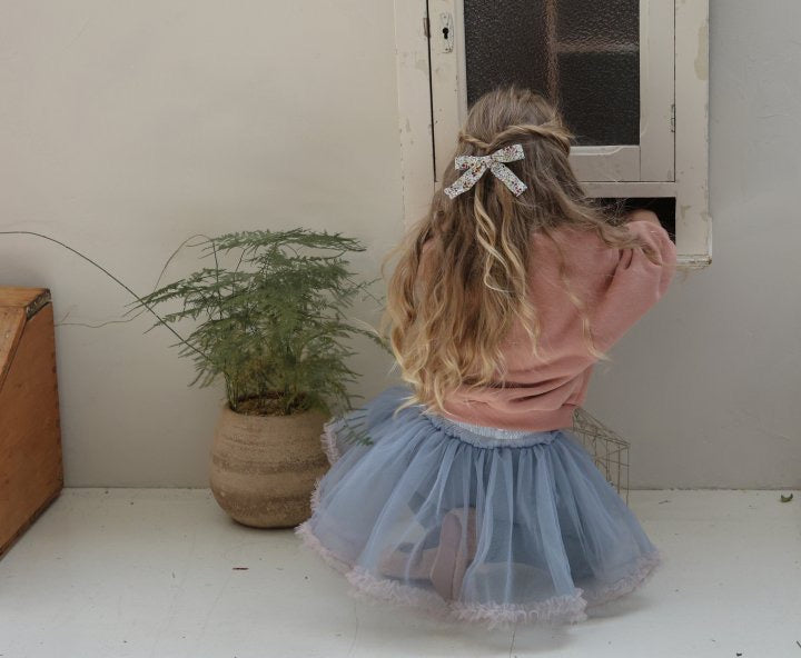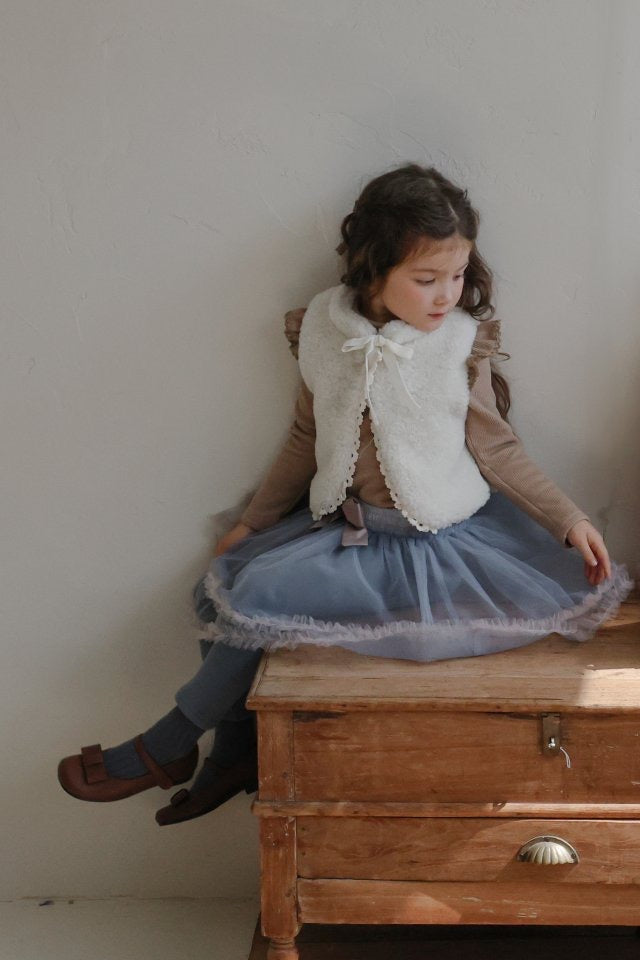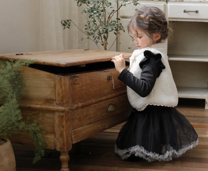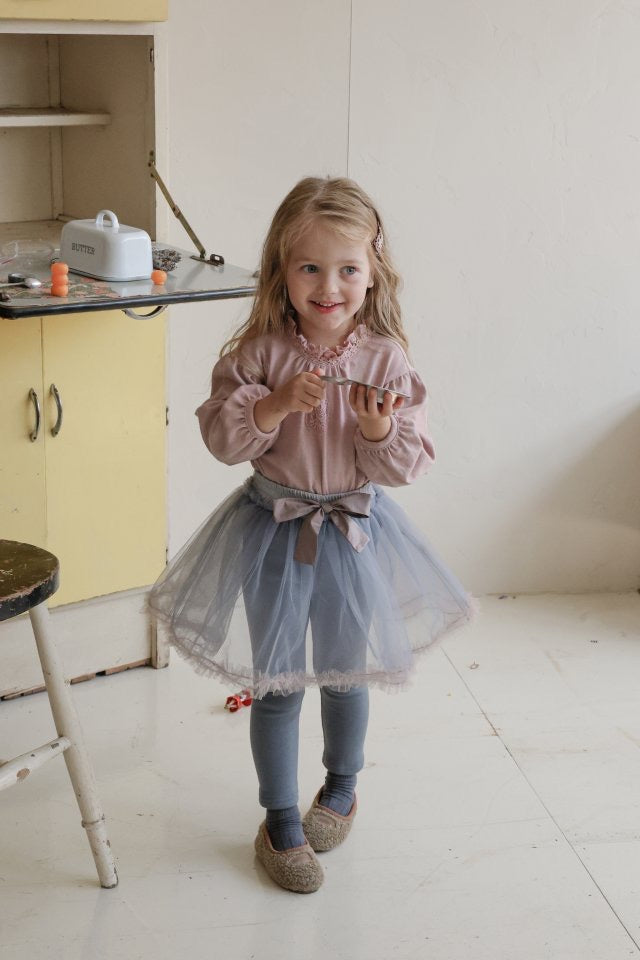チュールのチュチュスカートがロマンティックなムードを引き立て、裾のフリルディテールがふんわり感と愛らしさをプラスします。
