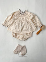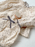繊細なレースブラウスとふんわりシルエットのブルマは、