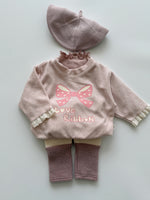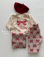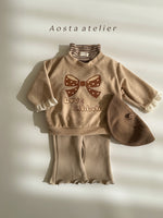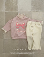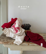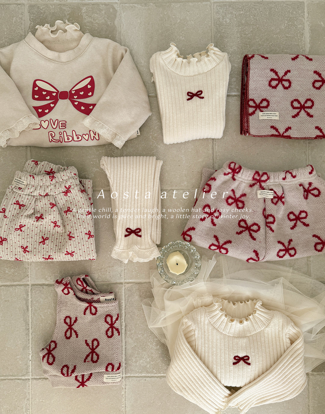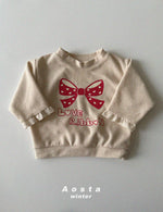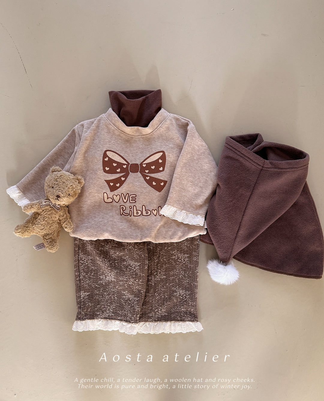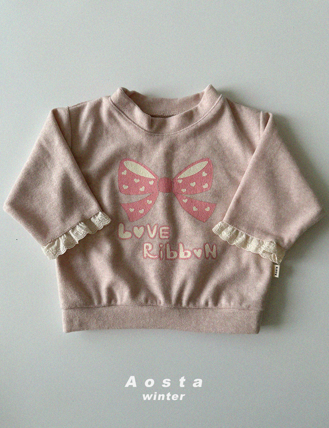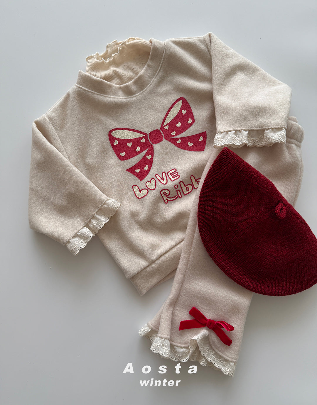 Aosta > 柔らかくて暖かい裏起毛スウェット。袖のレースとリボンハートプリントが可愛い!ラブリーでありながら動きやすさも◎。色味も素敵で、ジェリーパンツと一緒にどうぞ。