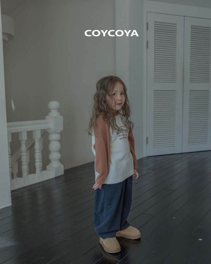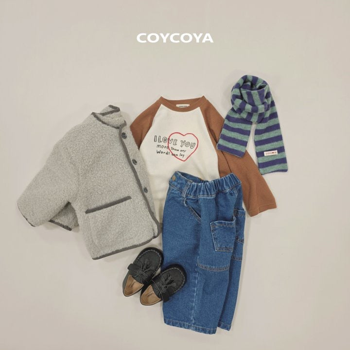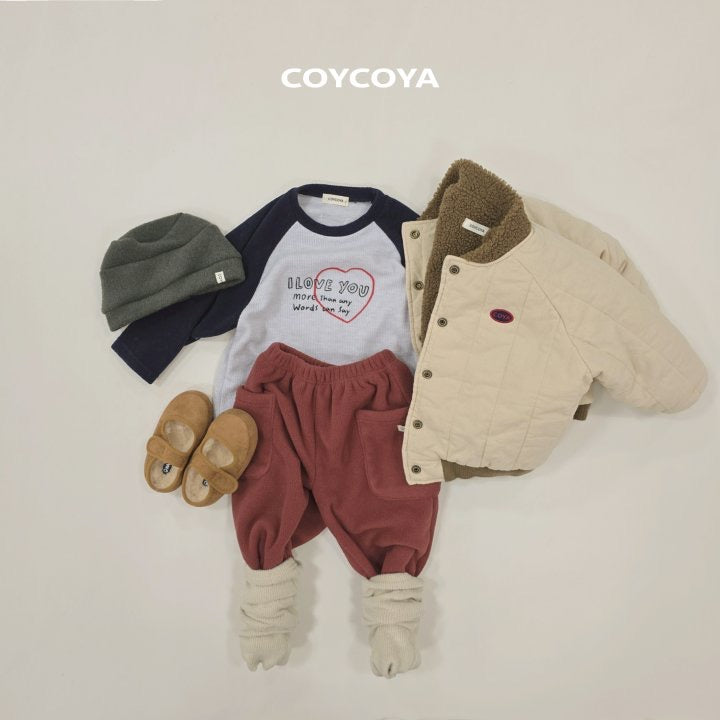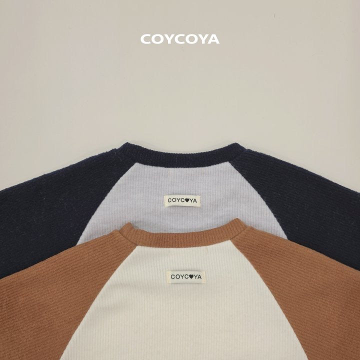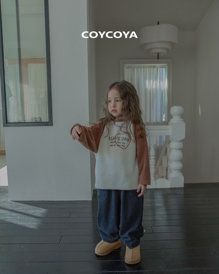 ニットのように温かい質感のTシャツ。起毛処理でふんわりリブ素材。ラグランフィットと配色カラーが特徴。ハートロゴとレタリングがアクセント。背面にCOYCOYAラベル付き。