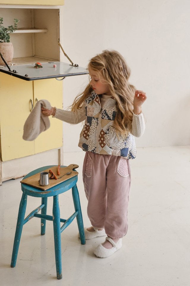 フラワーパターンのポケットパッチが可愛さをプラス。
