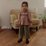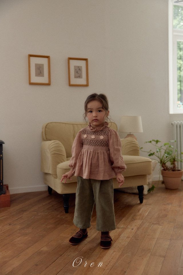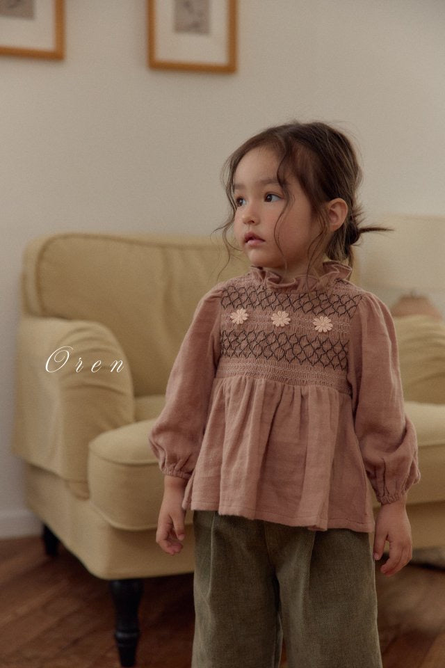 オレンらしい温もりを感じるスモッキング刺繍ブラウス。ヴィンテージ感あるカラーに繊細なハンドスモッキング刺繍を組み合わせ、クラシックで愛らしい雰囲気に。胸元には刺繍ディテールと花柄ポイント刺繍で優しい印象をプラス。ミニフリルのネックライン、自然なパフを演出する袖のギャザー、軽やかな裾のフレアが特徴です。