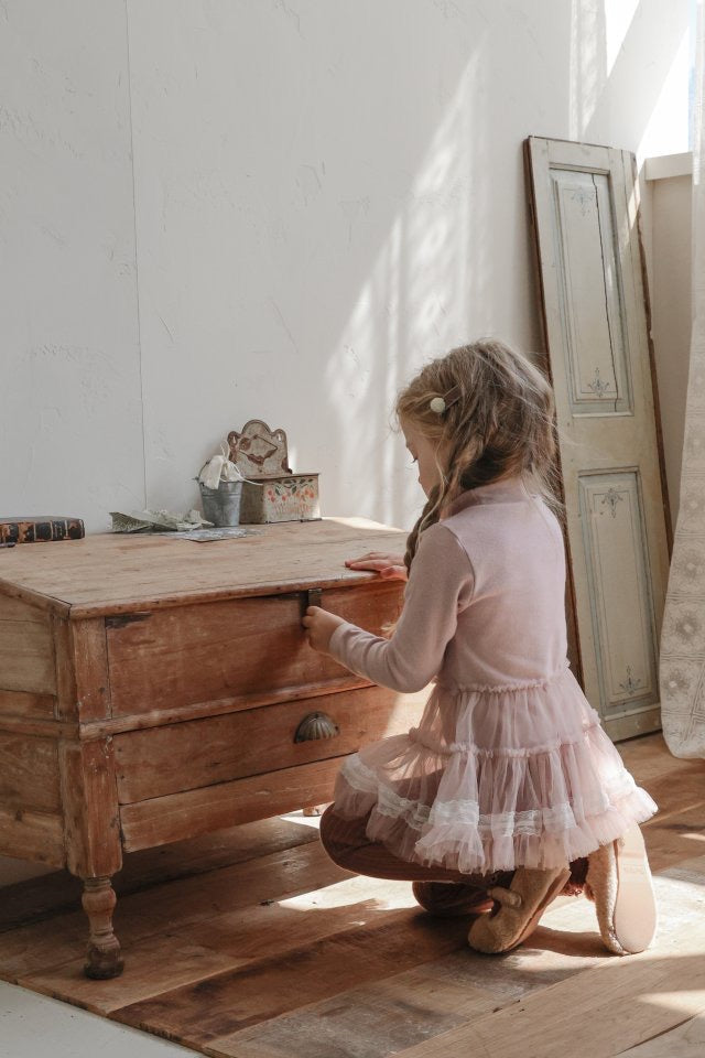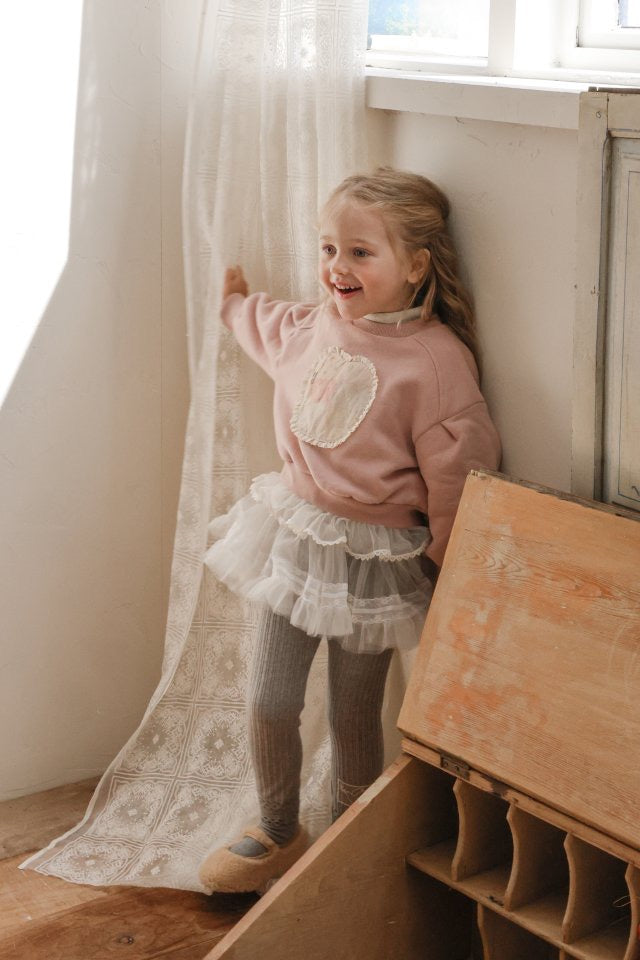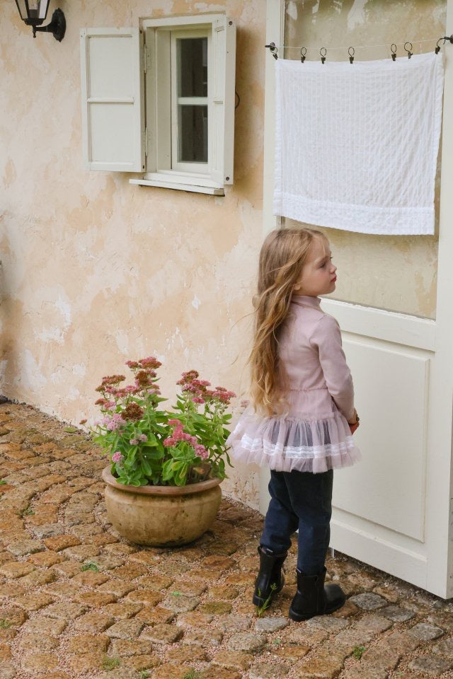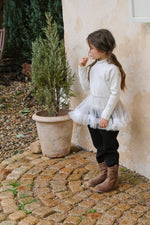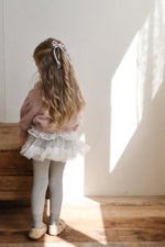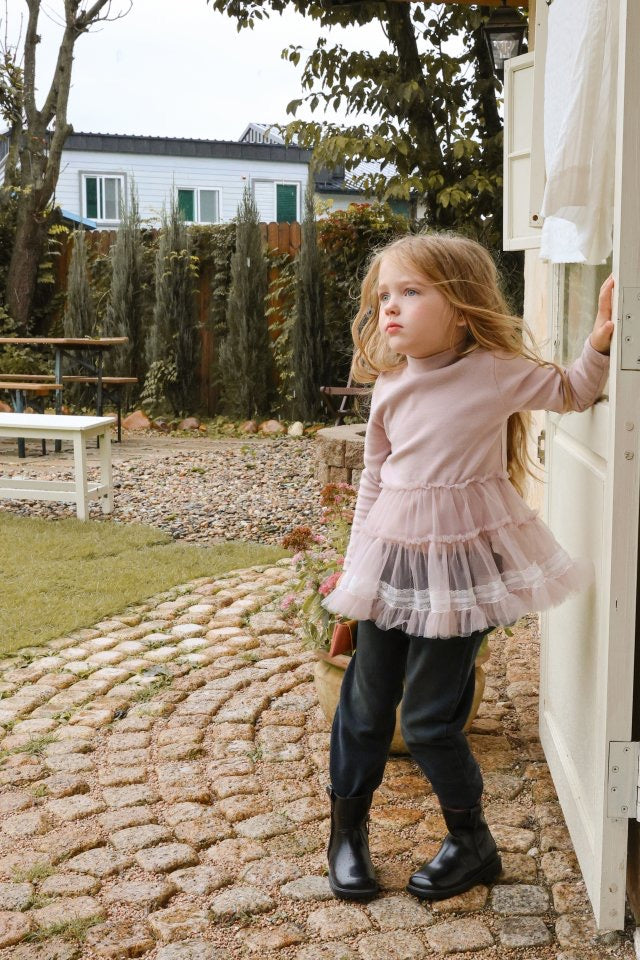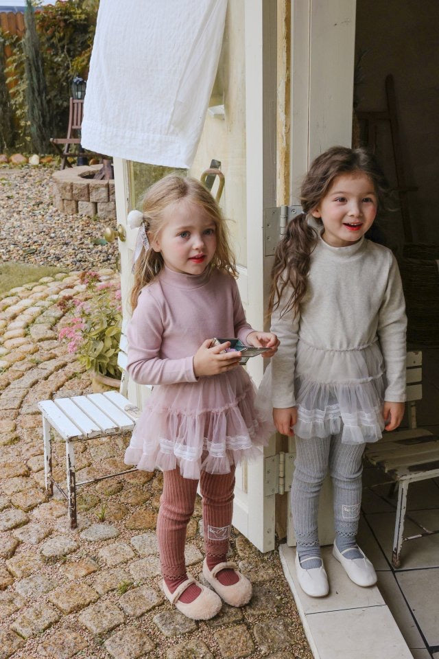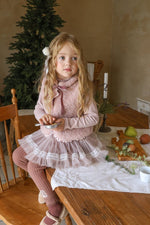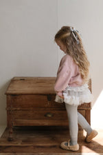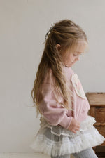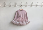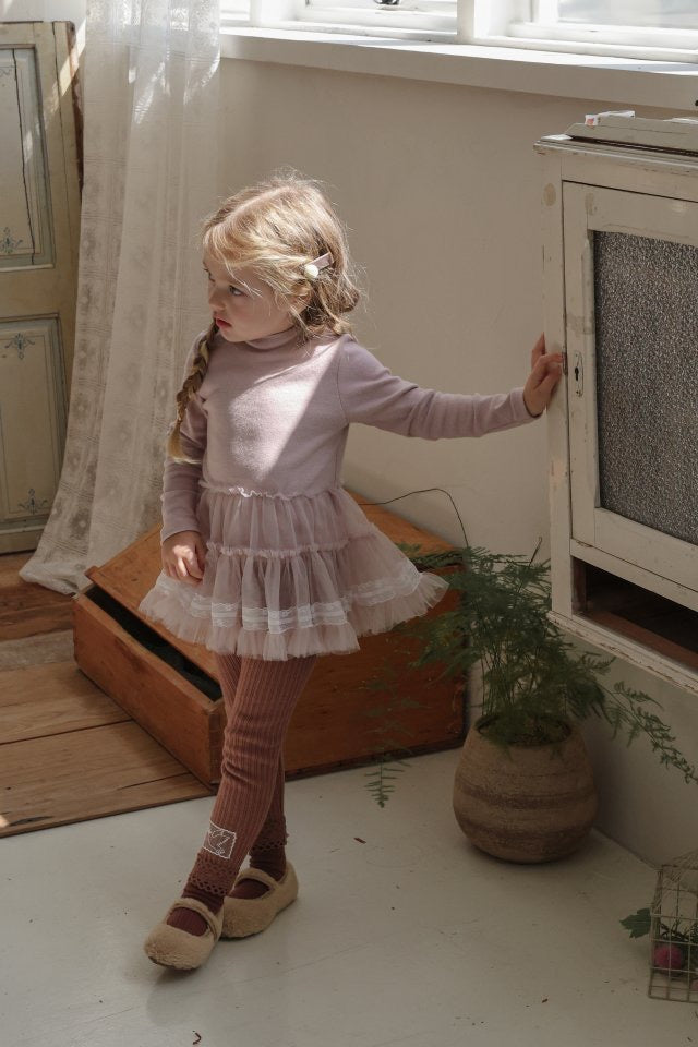 下身頃はふわっと広がるチュールスカートでエレガントなシルエットを演出します。
